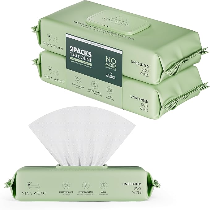 Dog Wipes – Fragrance-Free, Alcohol-Free, Hypoallergenic Pet Grooming Wipes with Aloe Vera, Biodegradable, for Dogs & Cats: Paws, Face, Ears & Butt – 2-Pack (140 Count)