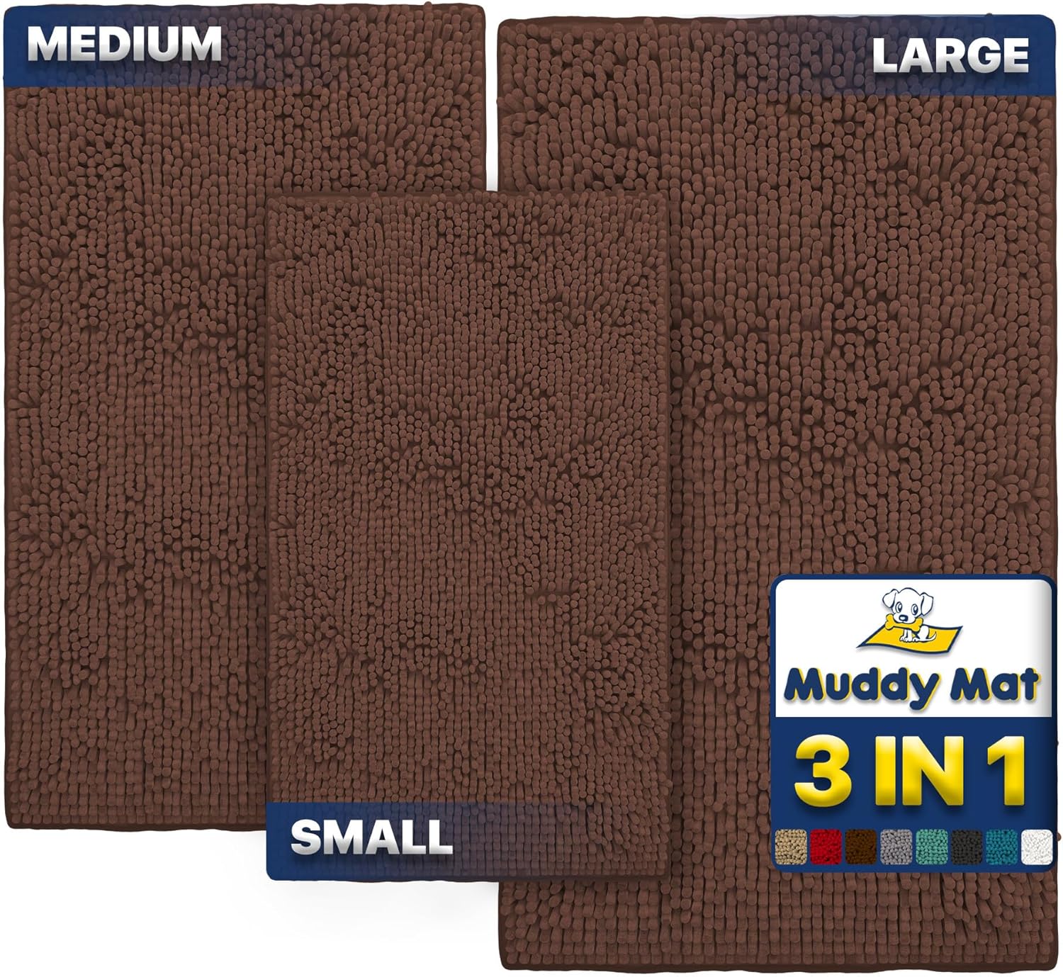 Muddy Mat® Pack of 3 Highly Absorbent Microfiber Dog Door Mat and Pet Rug, Non Slip Thick Washable Area Mat Soft Chenille for Kitchen Bathroom Bedroom and Outdoor - Brown Small, Medium & Large