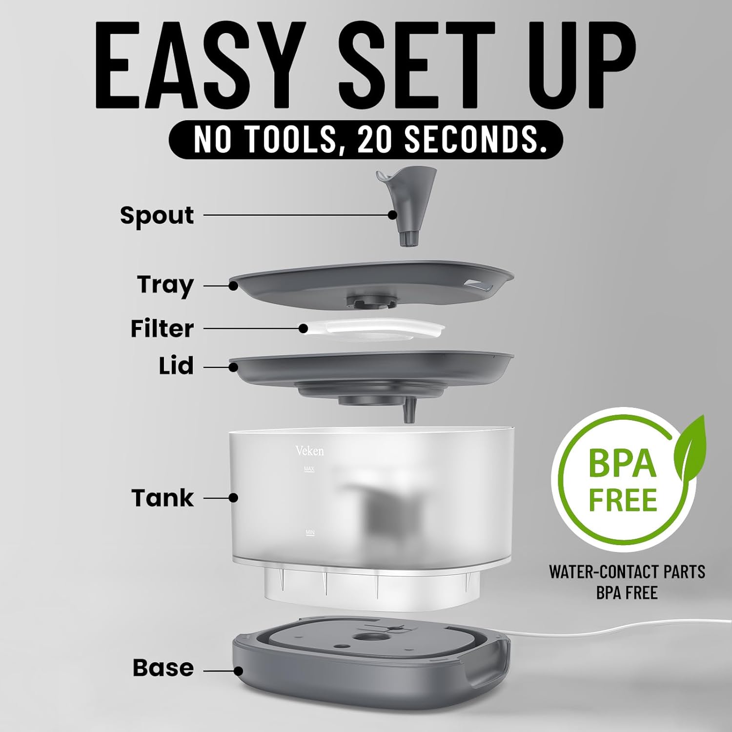 Veken Cat Water Fountain with Detachable Tank, Easy to Clean & Assemble, 84oz/2.5L Automatic Pet Drinking Dispenser with Quiet Operation & LED Light for Cats, Dogs and Small Pets, Grey