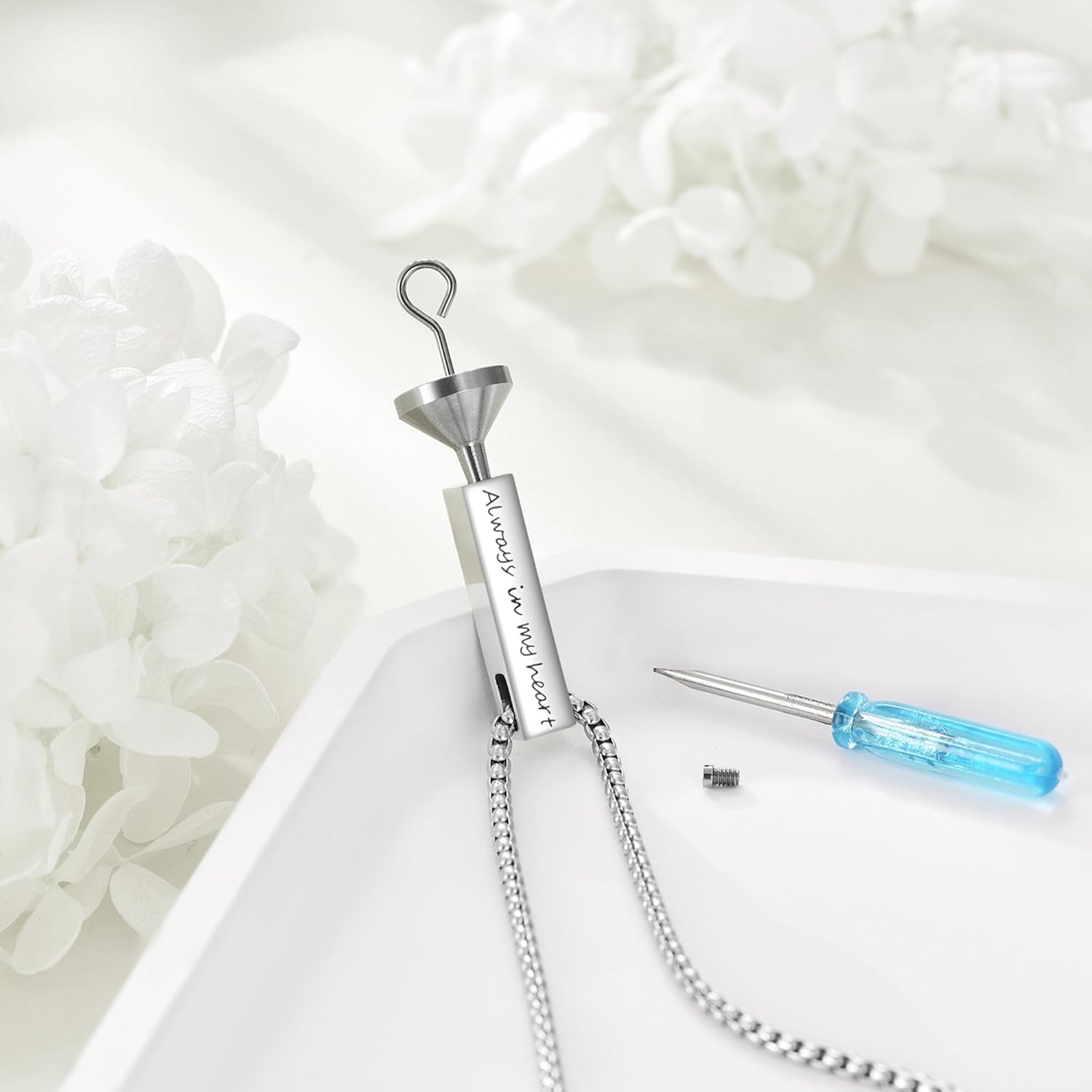 - ❤️Design:Bar opal urn necklace, Screws from the bottom of urn, allowing you to place a small amount of ashes in it. If you don't want/have ashes, you can also pour perfume in or add crushed flowers, dirt, hair, sand and notepaper.