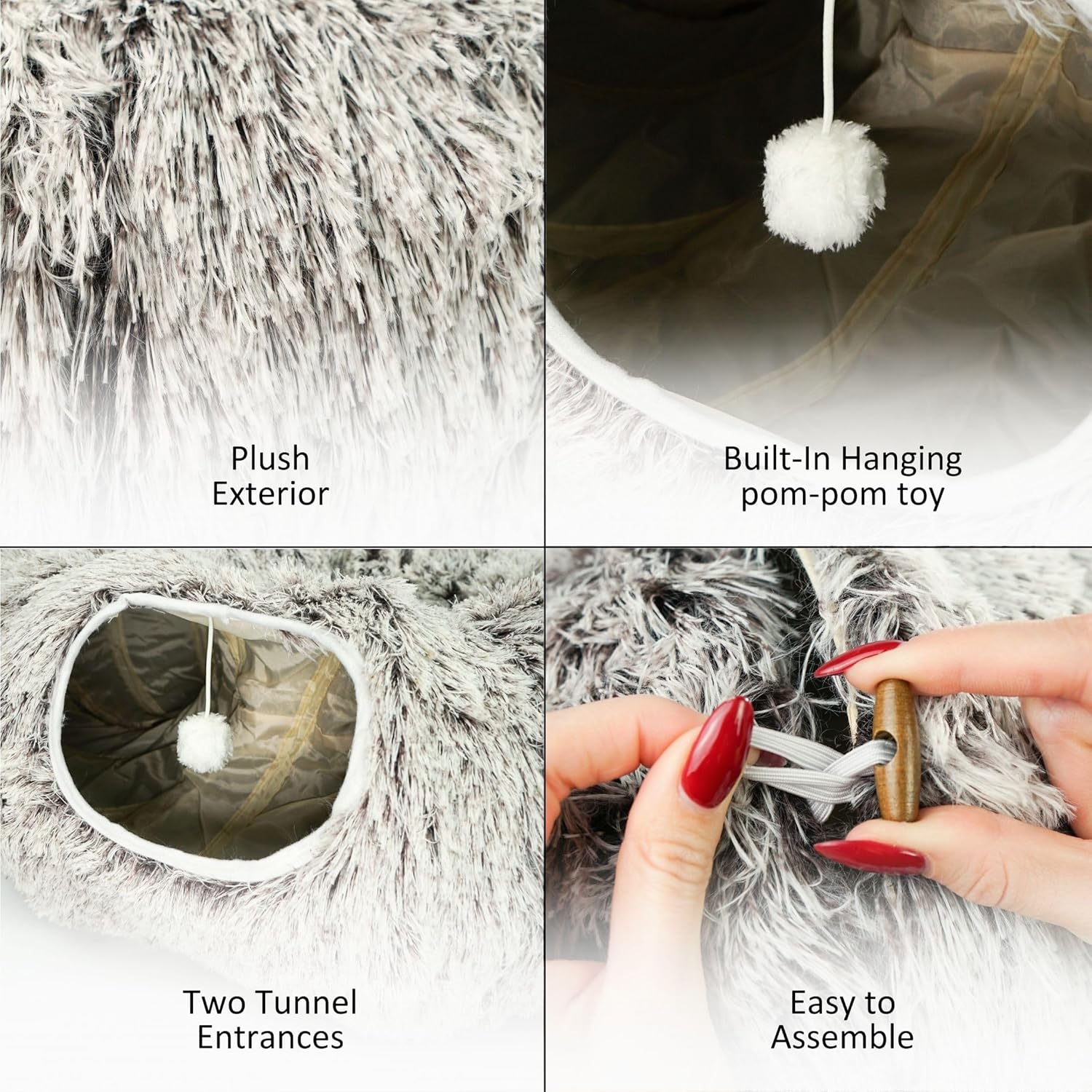 - Cozy Hideaway & Play Tunnel – Plush nook with dangling toy creates a secure retreat and doubles as one of the most fun cat toys for indoor cats.