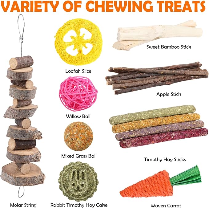 - 10 KINDS OF GUINEA PIG TOYS:The guinea pig cage accessories set includes: 1 guinea pig tunnel(17.7"x5.9"), 1 molar string, 2 rabbit timothy hay cakes, 2 woven carrots, 2 willow balls, 2 mixed grass balls, 2 loofah slices, 2 sweet bamboo sticks, 4 timothy hay sticks, 6 apple sticks. Perfect for guinea pigs, hamsters, ferrets, rats, rabbits, chinchillas, hedgehogs and other small animals.chinchillas, hedgehogs and other small animals.