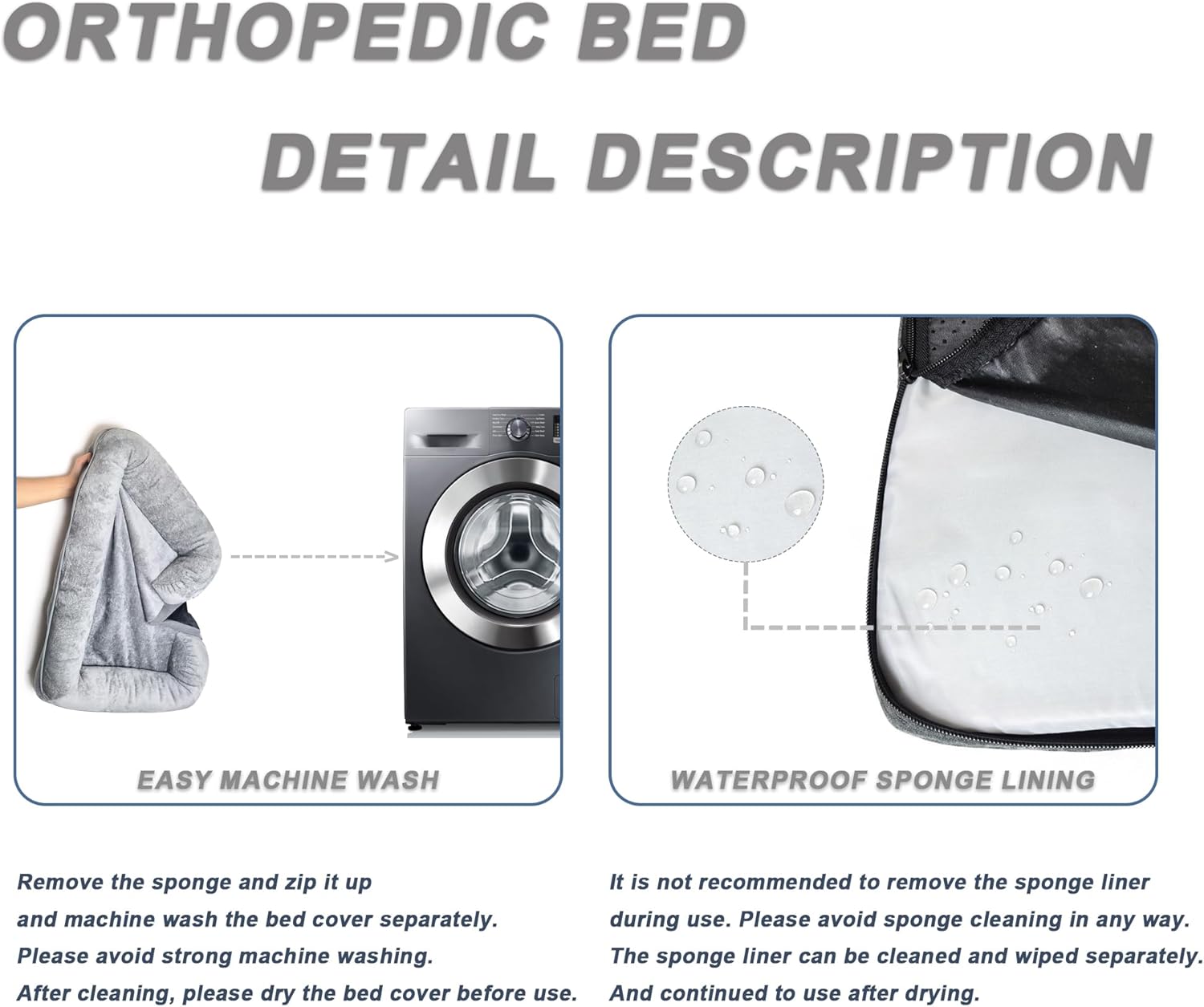 - Easy-to-Clean & Durable Cover: Machine-Washable & Dryer-Safe – Removable zippered cover resists hair trapping and withstands scratching. Waterproof Liner – Blocks accidents from seeping into foam while staying quiet and comfortable.