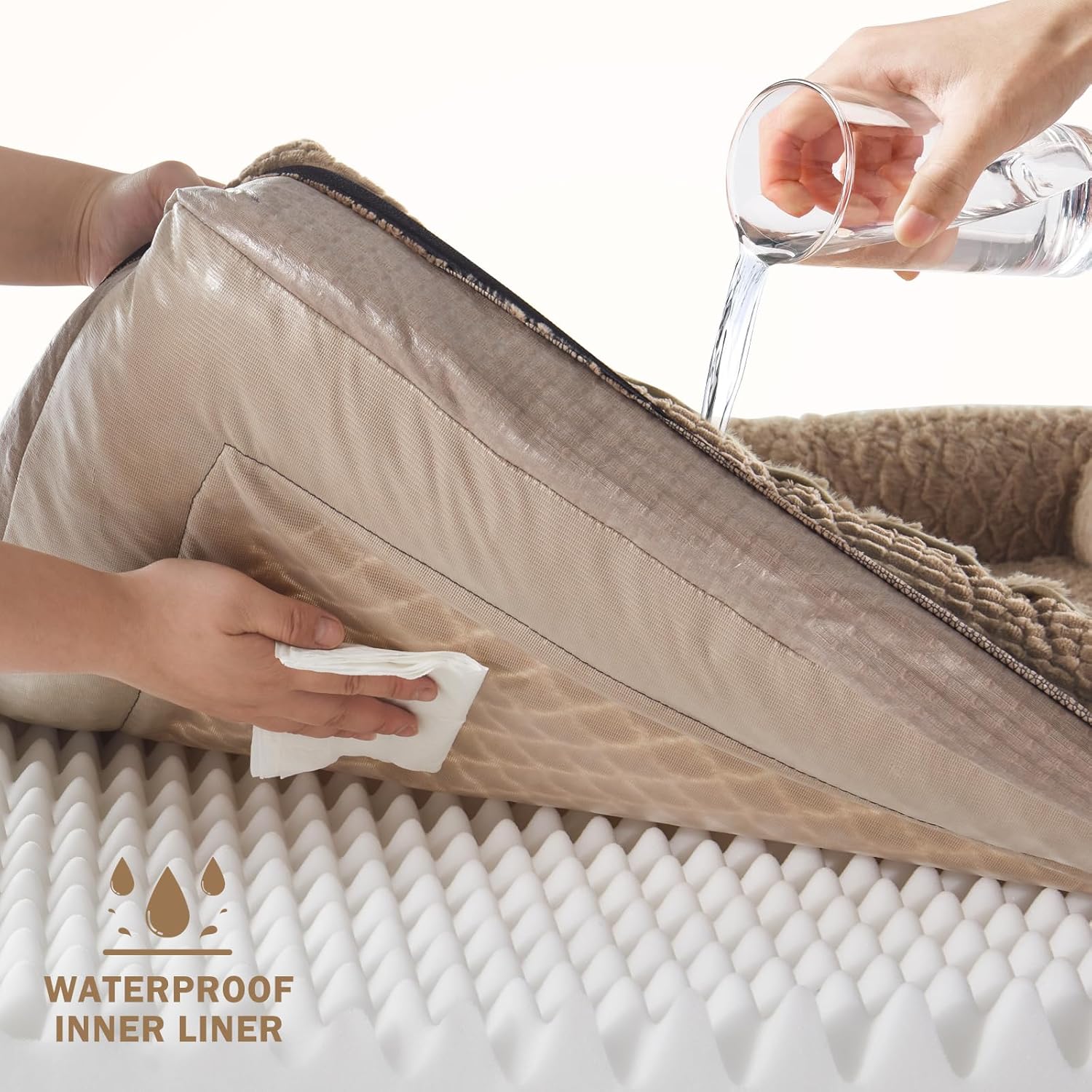 - 🐶WATERPROOF & WASHABLE DOG BED: The dog bed features a fully removable, machine-washable cover with a smooth double zipper for easy to quick remove and care, so just throw it in the washing machine and will be as good as new, ensuring your pet's space stays fresh and hygienic. The waterproof inner lining on the back of the dog bed cover fully protect the egg crate foam from spills, water damage, or accidents, prolonging the product's life.