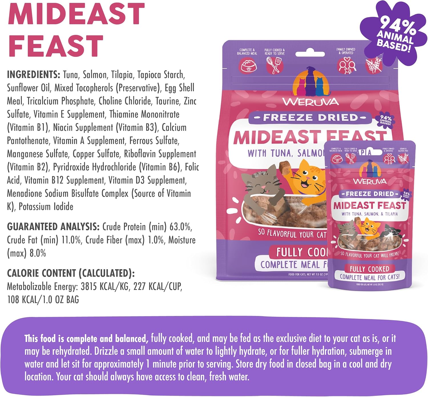 - Weruva Cat Freeze Dried Mideast Feast, 1oz Bag. Gently cooked tuna, tilapia, and salmon with sunflower oil. No bones or organs