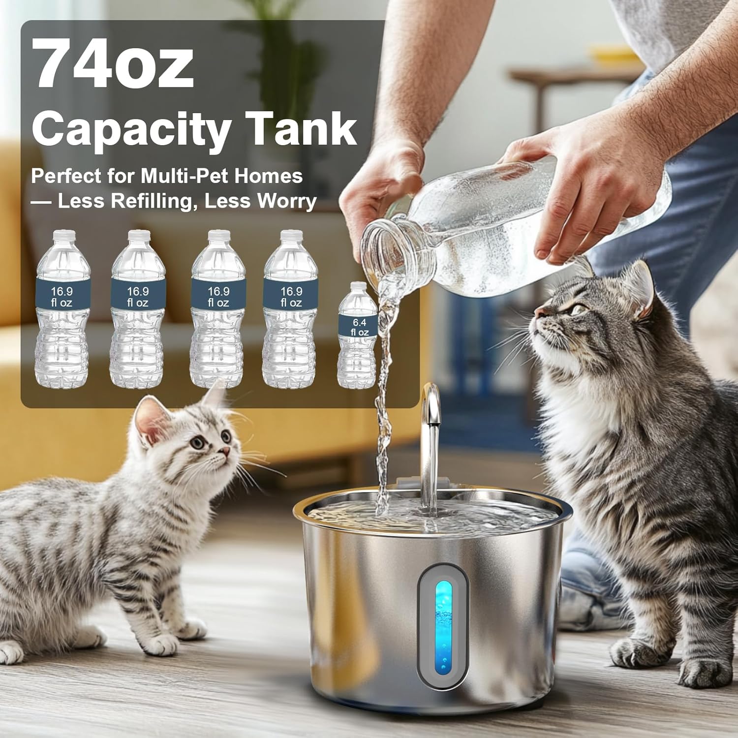 - Large 74 oz Capacity With a generous 74 oz (2.2L) capacity, this stainless steel pet fountain reduces the need for constant refills. It keeps your cat or small dog hydrated for up to 7 days — perfect for busy schedules or short trips away from home.