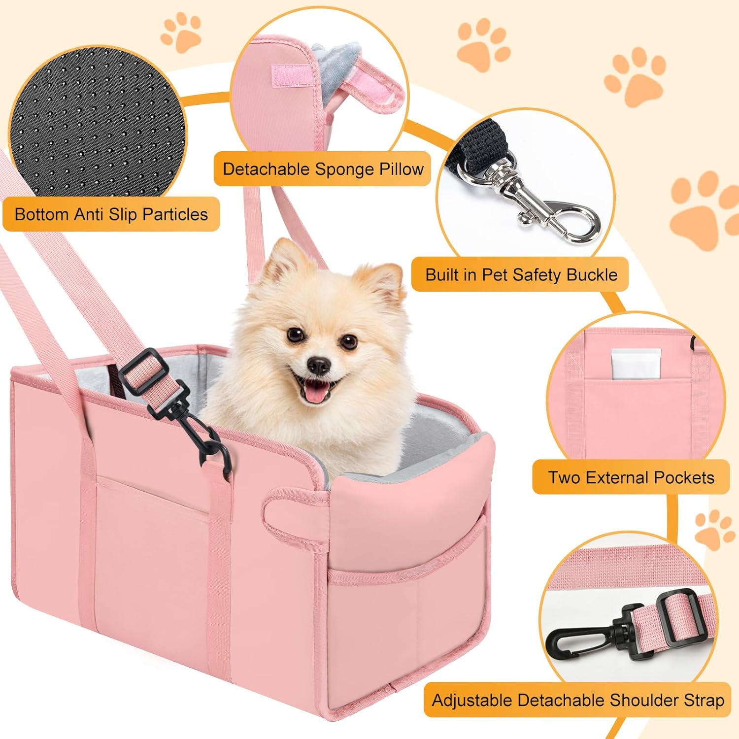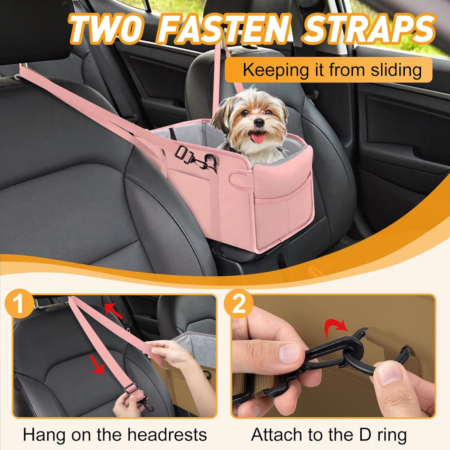 Portable Dog Car Seat for Small Dogs - Adjustable Safety Leash, Washable Cushion & Storage Pocket - Pet Booster Seat for Car Travel- Pink