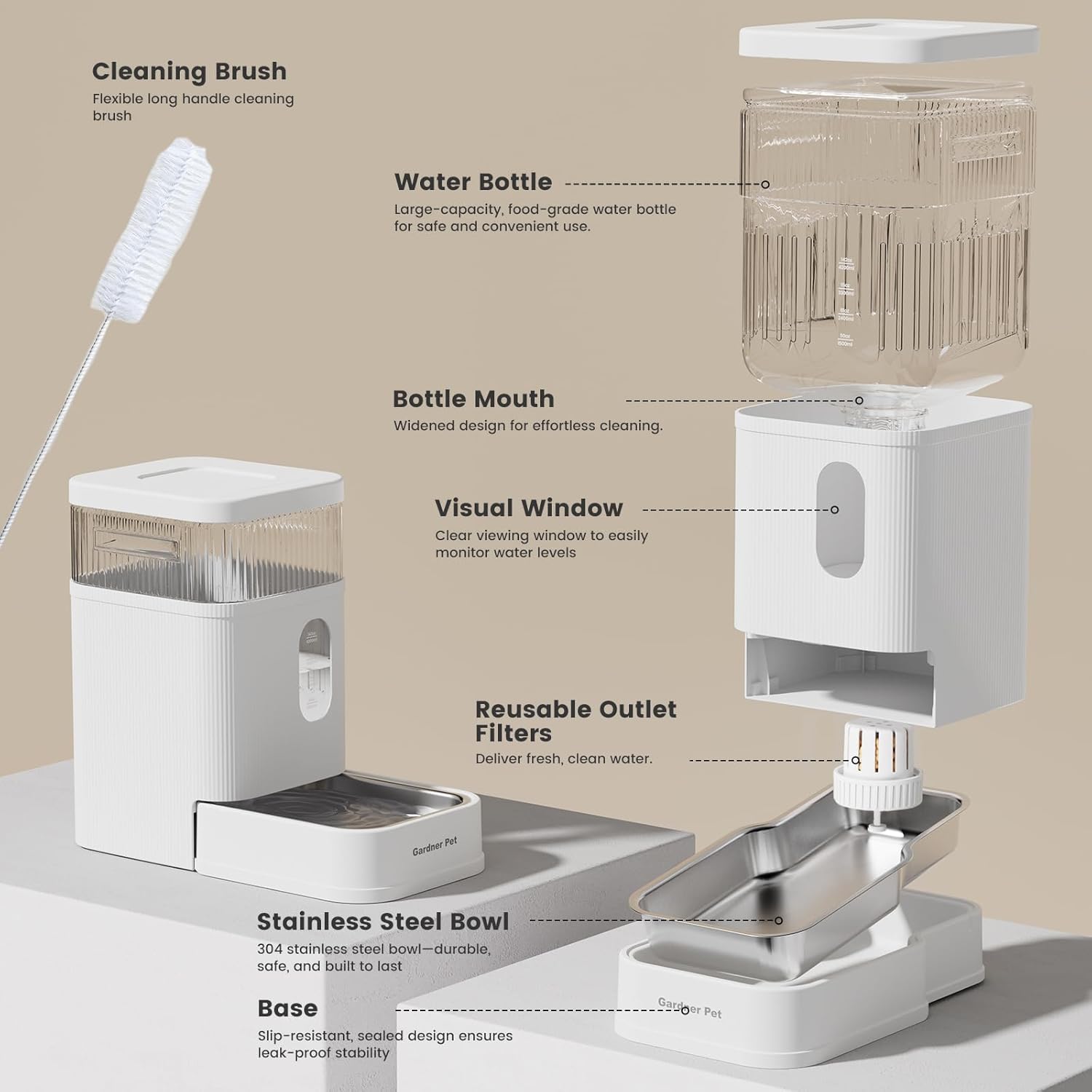 - Premium Pet-Safe Materials - Gardner Pert dog water bowl dispenser comes with 304 stainless steel bowl + cleaning brush guarantees a safe, easy-to-clean water supply for pets.