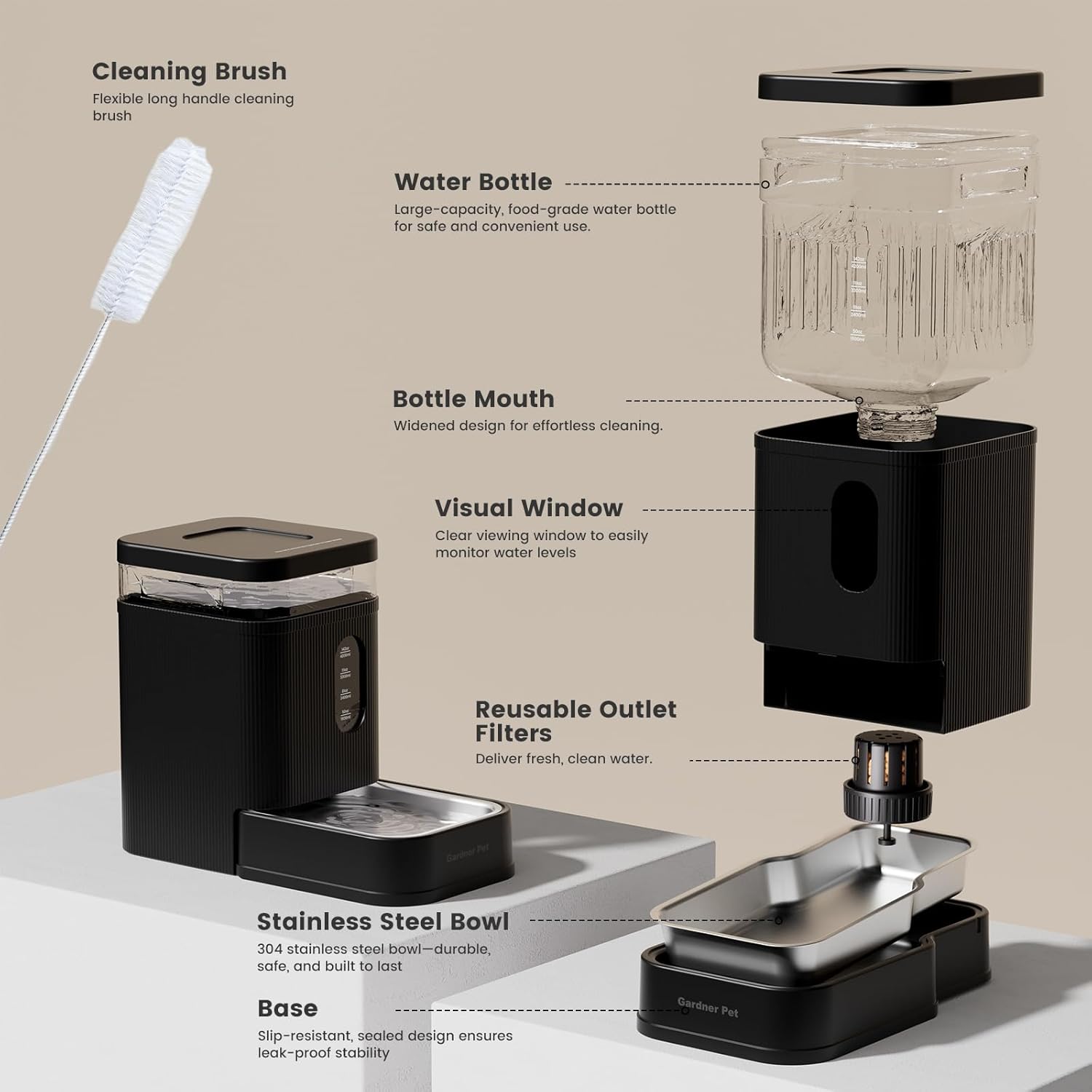 - Premium Pet-Safe Materials - Gardner Pert dog water bowl dispenser comes with 304 stainless steel bowl + cleaning brush guarantees a safe, easy-to-clean water supply for pets.