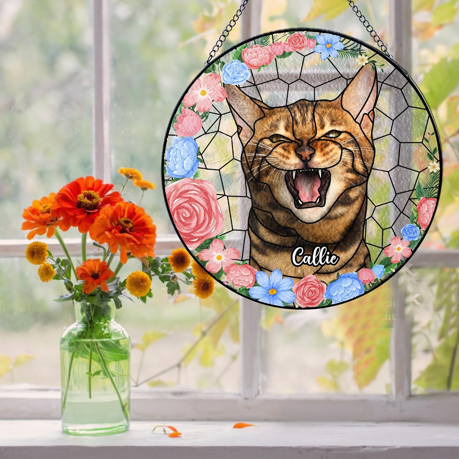 - Custom Engraved Pet Memorial Suncatcher – A beautiful stained glass ornament, personalized with your pet’s name and photo, creating a heartfelt tribute to your furry friend.