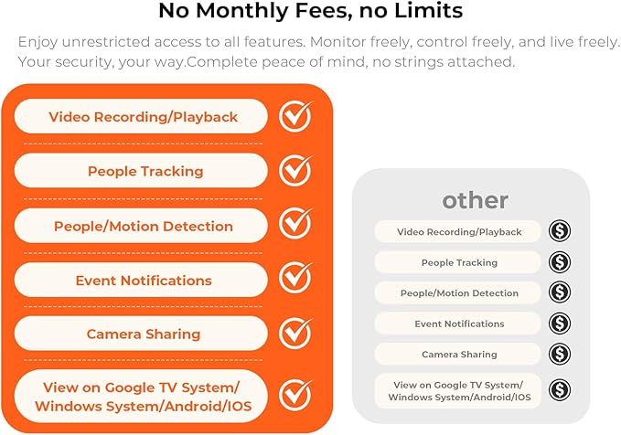 - Multi-Platform Access & Family Sharing: View your home from anywhere. Access live feeds and recordings on Google TV, computers, or iOS/Android devices. Easily share this camera for home security with family members for simultaneous monitoring - perfect for baby, pet, or elderly care