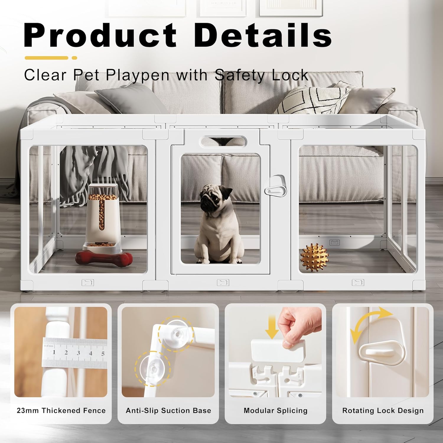 - TRANSPARENT & SAFE DESIGN: Our clear acrylic dog playpen features seamless, transparent panels that provide a bright, open environment, reducing stress for pets. Unlike metal bars with risky gaps, the smooth, gap-free design prevents climbing, escaping, or injuries like stuck paws.