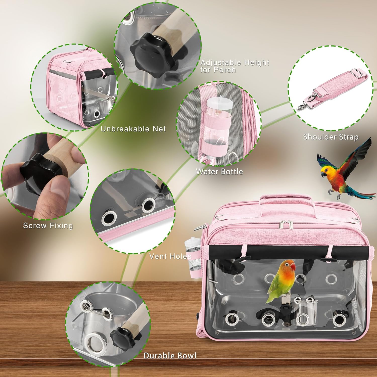 - 【FEEDING & PERCHING】There are a removable bowl, a water bottle and a perch come with the bird carrier. It provides a comprehensive care and comfortable environment for birds even in a long travel.