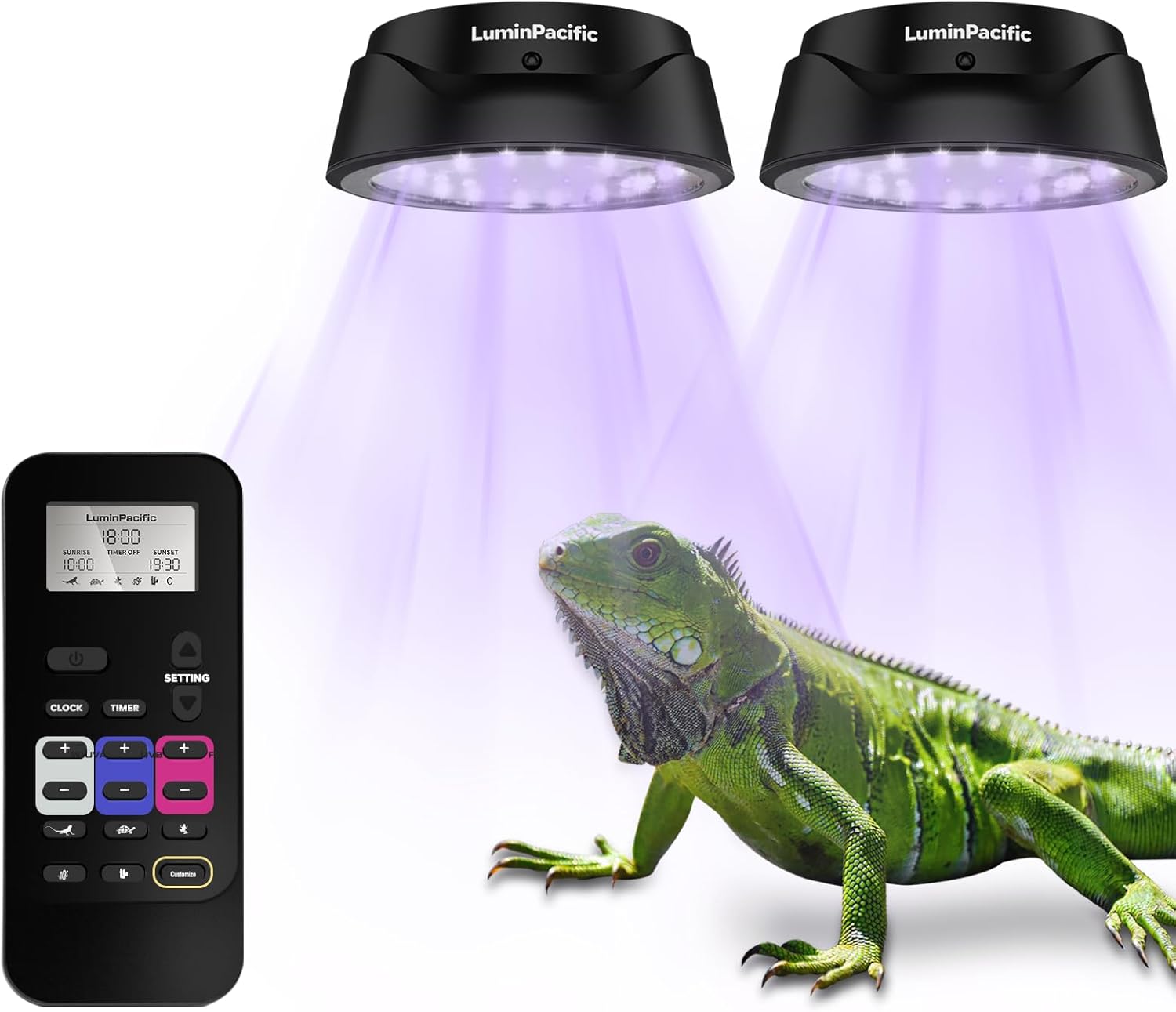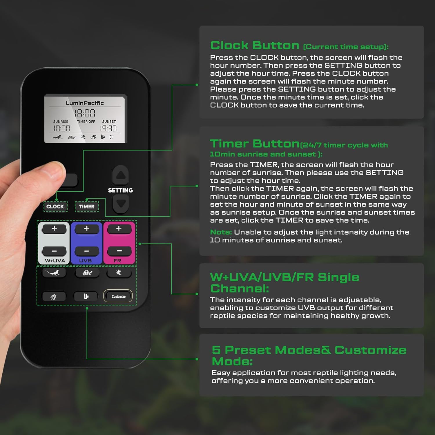 - LCD Remote Control: The LuminPacific UVB reptile light comes with an LCD display remote control that allows for precise lighting control. You can set daily sunrises and sunsets with a 10-minute ramp-up/down, and independently adjust UVB, UVA, and FR light brightness with 10 levels for a customized reptile habitat.
