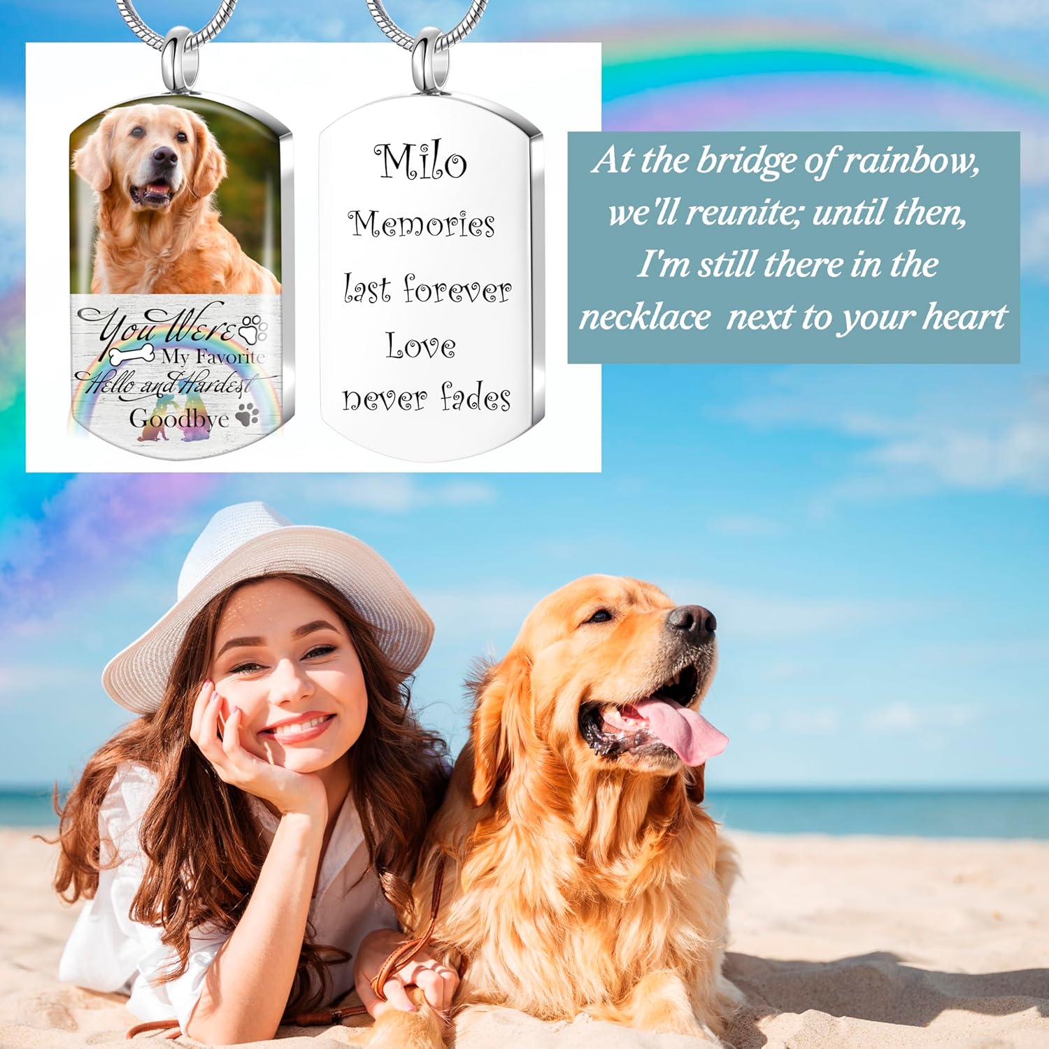 - Eternal Memorial Across the Rainbow Bridge: This pet memorial necklace carries your love to the Rainbow Bridge, where your beloved pet plays happily. You can personalize the front with photos of your beloved pets, and engrave their names, dates, or commemorative words on the back to bring their memories closer to your heart
