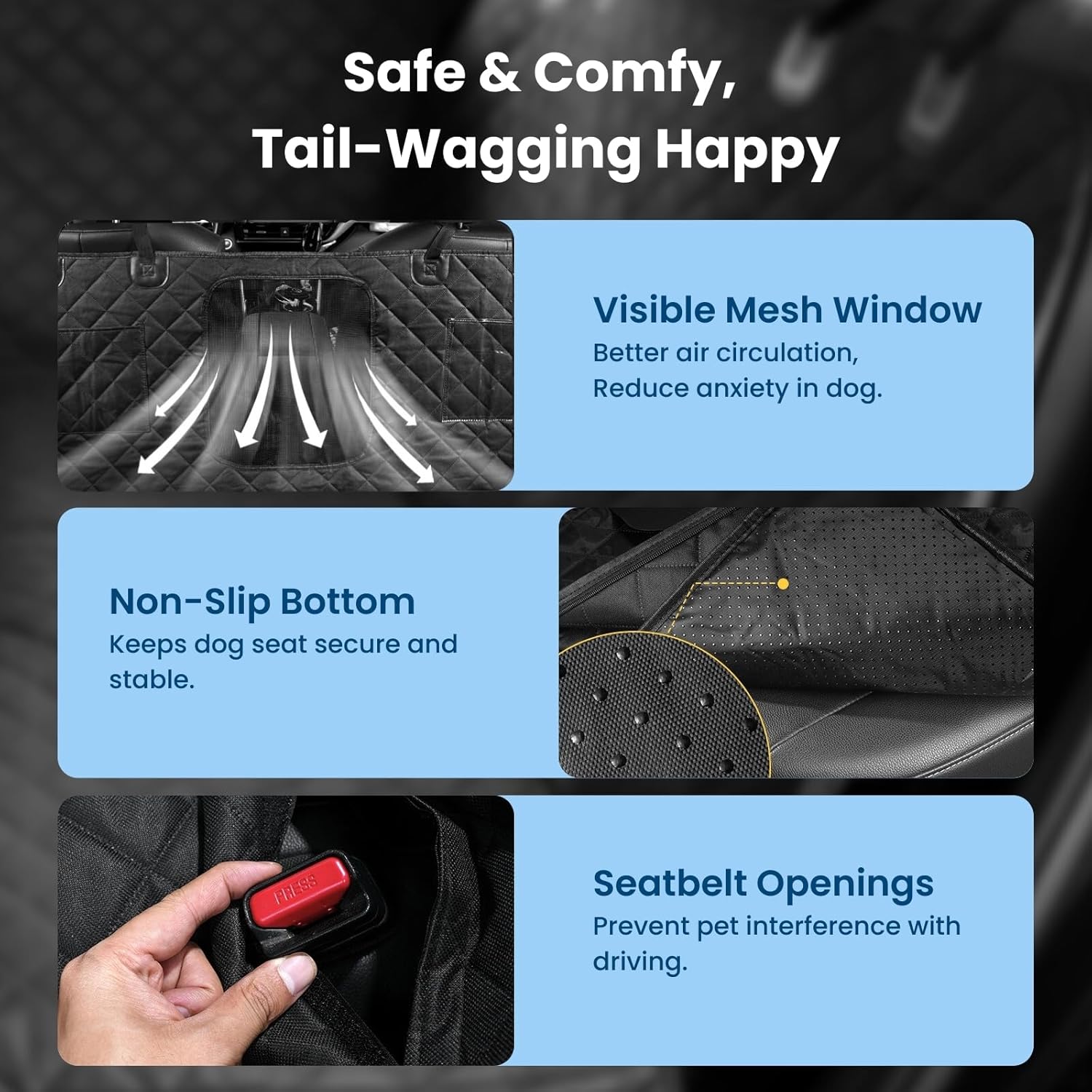- Breathable Comfort: Built-in mesh window of our backseat dog cover allows your dog to see you and enjoy better airflow, and relieve the dog's anxiety on long-distance driving