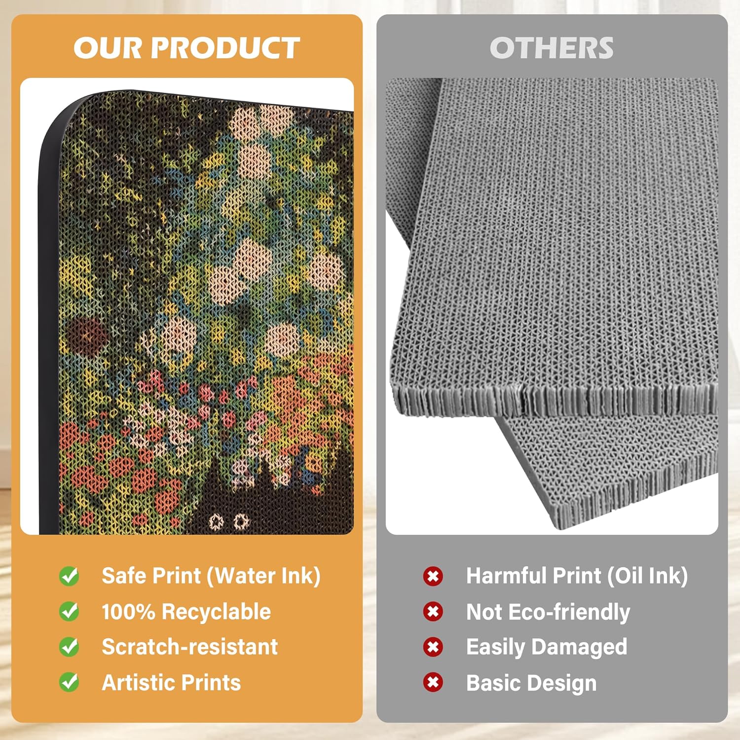 - Safe water-based ink: Our cat scratching pad is made from durable, high-density corrugated cardboard, free from harmful substances. Printed with water-based ink, safe even if your cat lick or bite. Fully recyclable, reducing environmental impact-great for indoor cats