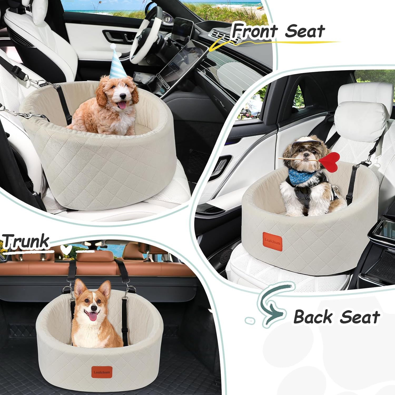 Dog Car Seat for Small Dogs Up to 30 Lbs,Ultra Soft Fabric Fill in Comfy Memory Foam,Happy Pet Ride,2 Safety Dog Leashes,Fully Detachable and Washable,Anti Slip Base(Beige)