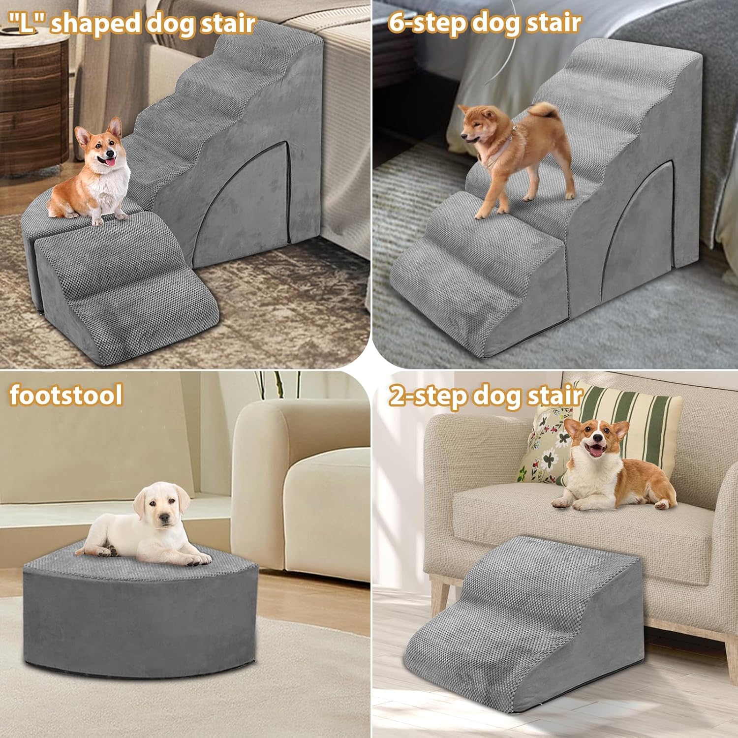 - Upgraded Foam Dog Stairs: Our dog stairs feature adjustable sections, allowing you to customize the arrangement to best suit your needs. With "L" shaped stair attachment to maximize space and prevent tripping hazards, this ramp is a versatile and safe option for your pet. It easily converts into either a 6-step or 2-step pet stair for added functionality