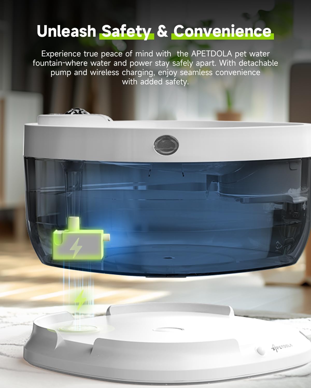 - 【Wireless Convenience】No more messy cords or tangled cables. The wireless design of the cordless pet water fountain makes it easy to place anywhere in your home, whether it’s the living room, kitchen, or bedroom. Its flexible placement options help keep your space clean and organized, while the wireless feature ensures a seamless experience.
