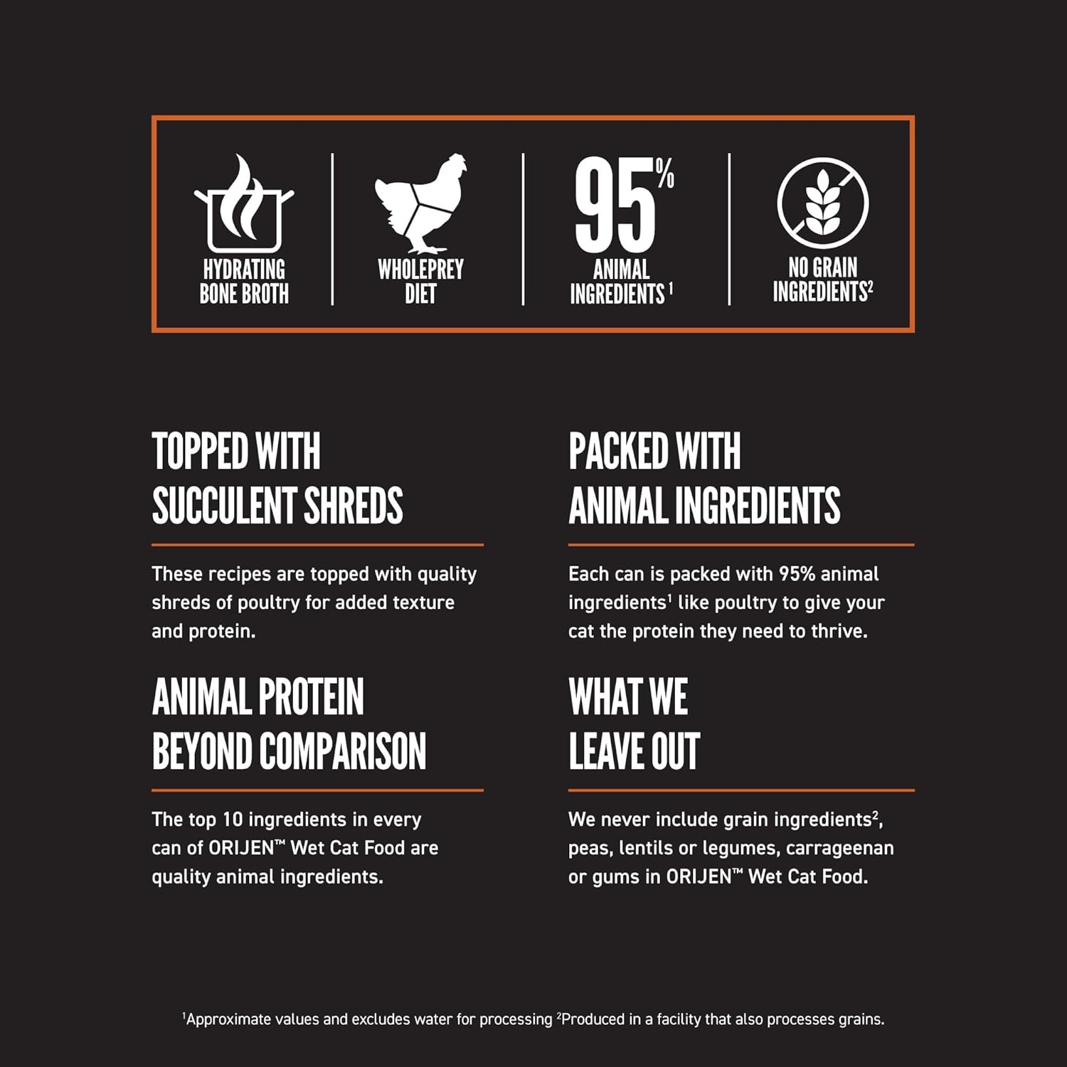 ORIJEN Chunks & Shreds Wet Cat Food Variety Pack: Original + Salmon & Chicken Entrées 3oz Cans (12 Count, 6 of Each)