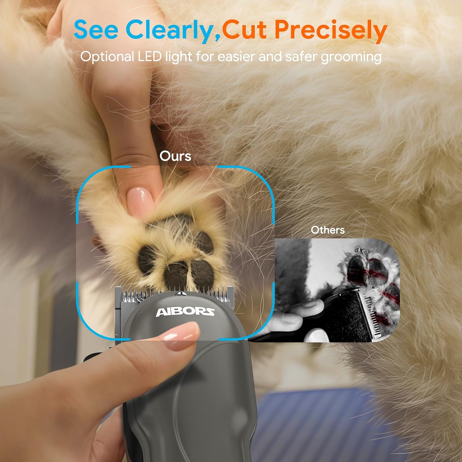 - Effortless Grooming with Superior Blades: The Aibors cordless dog clipper features durable stainless steel blades that stay sharp for precise and efficient trimming. Whether dealing with thick coats or matted fur, this clipper trims smoothly without pulling or hurting your pet's skin, ensuring a pleasant and safe grooming session.