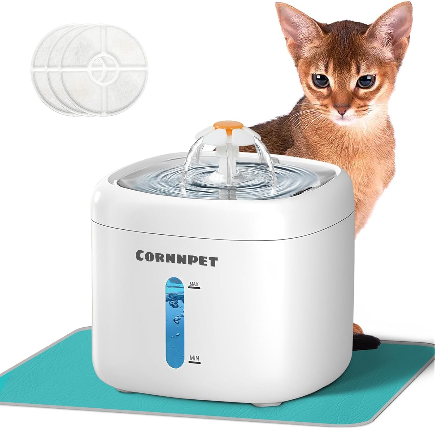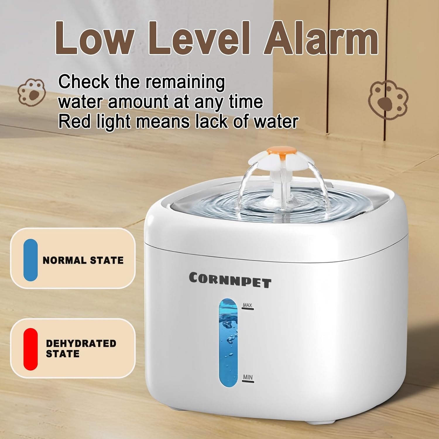 - 【74Oz/2.2L Large Capacity】Cornnpet cat water fountain has a 2.2L/74oz large capacity, which is suitable for small and medium-sized pets. and can last up to 7 days when filled with water. It does not require frequent refilling, so even if you are away for a few days, you do not have to worry about your pet's drinking water.