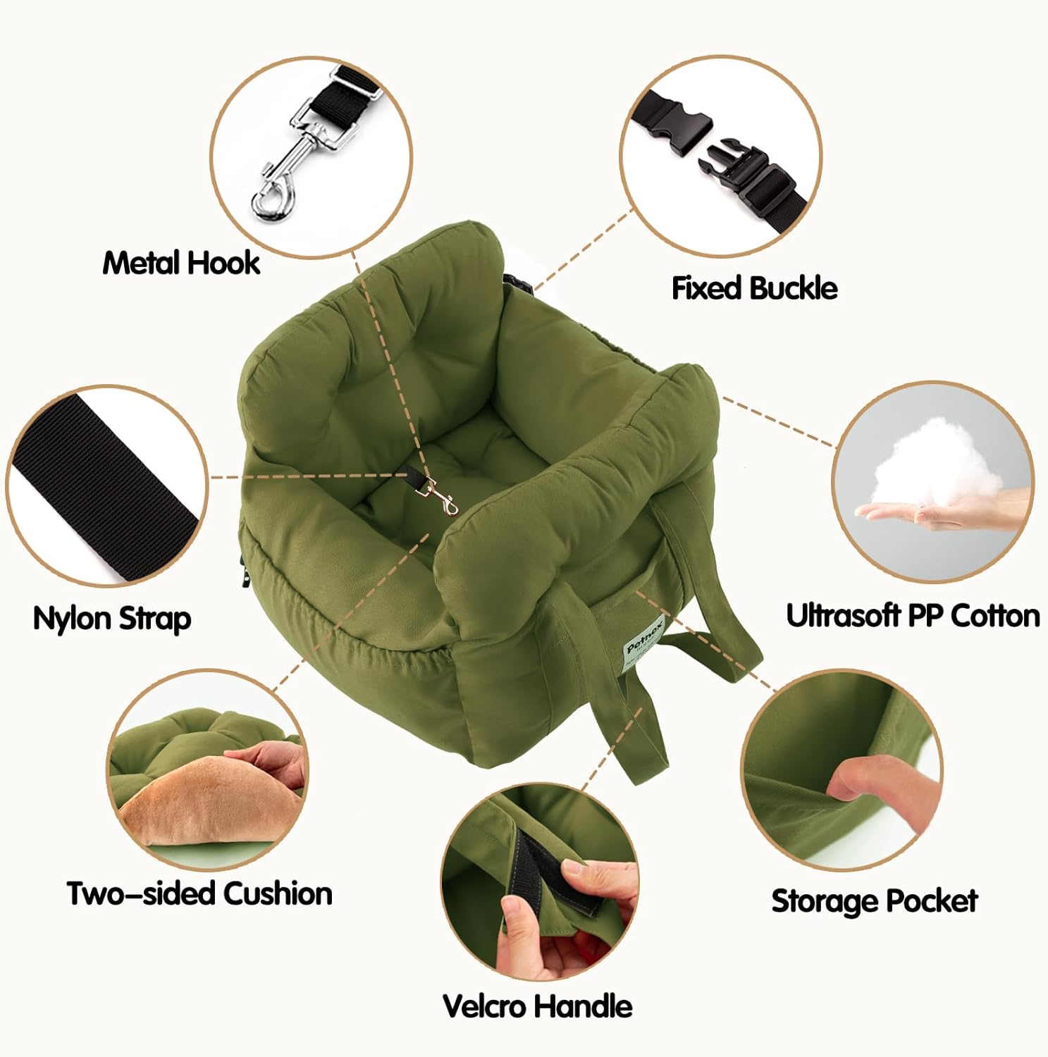 Dog Car Seat for Small Dogs, Portable Puppy Car Seat of Easy Installation, Fashionable Pet Carrier Bag with Large Pockets, Machine Washable Dog Booster Seat (Army Green)