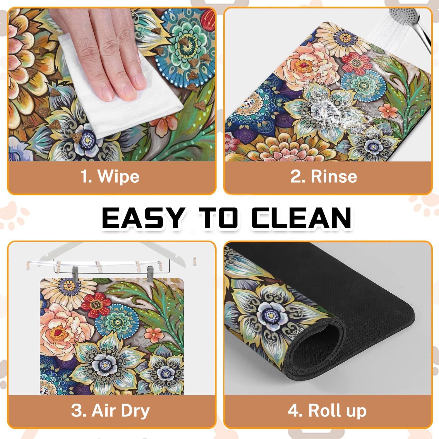 - 【Anti-Slip & Leak-Proof】The back of the pet mats for food and water features non-slip rubber that stays firmly on the floor, ensuring your pet doesn't drag it around. The waterproof rubber bottom provides excellent leak protection, preventing damage to your floor.