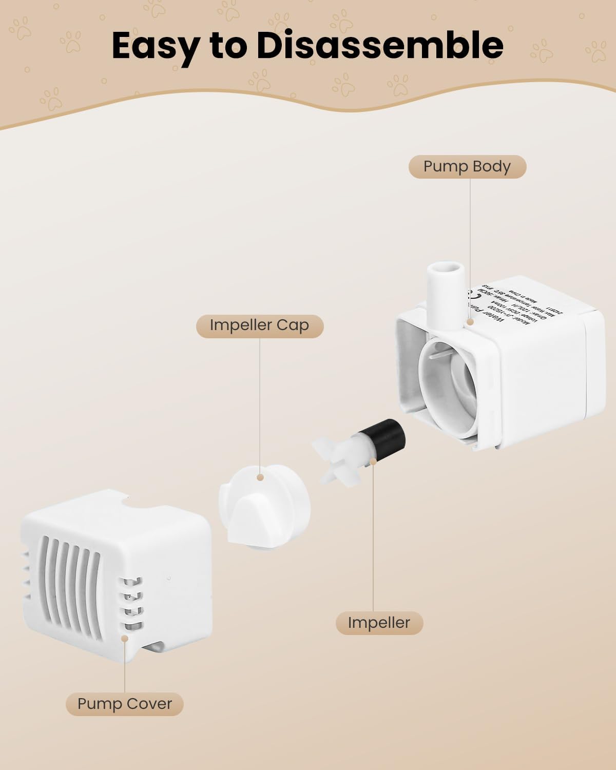 - Easy to Clean:The pet water fountain pump is easy to disassemble and easy to clean.First remove the pump cover. Then remove the impeller cover. The third step, remove the impeller and clean the parts with soap and warm water
