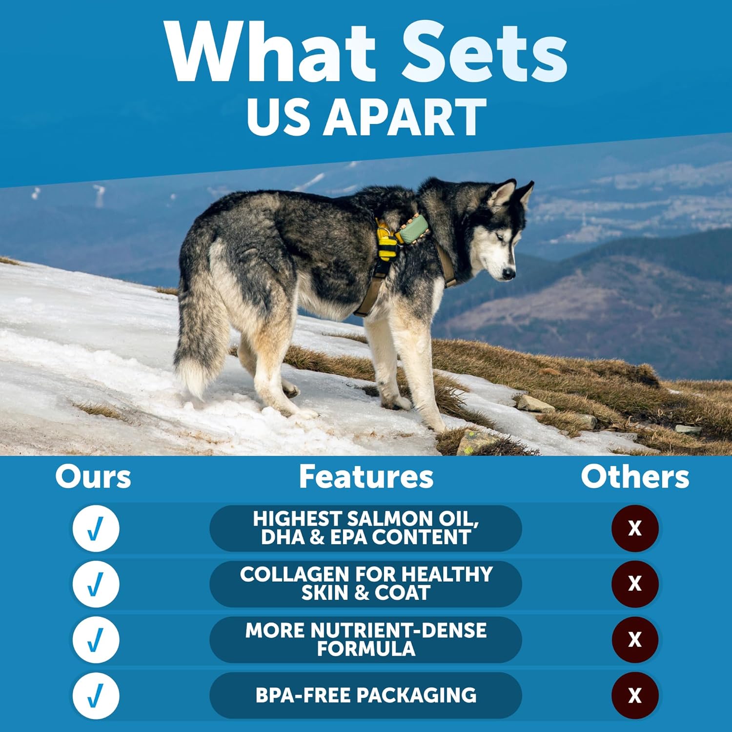 - Rich in Omega 3 from Salmon Oil: Each soft chew delivers EPA & DHA from premium fish oil for dogs - promotes a healthy coat, soothes dry skin, and helps reduce excessive shedding.