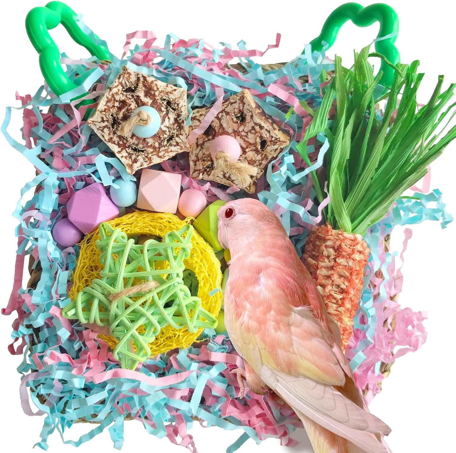 - NATURAL and SAFE MATERIAL : Recommended by Bird Behaviorists , Tyotrbs Cockatiel Toys are made of high quality seaweed hand-woven 24h as a base with 6 natural chewing elements (rattan ball, corn husk, corn cob, corn braid, lasso, loofah flakes, etc.), and many parrot owners give feedback of shinier feathers after using them