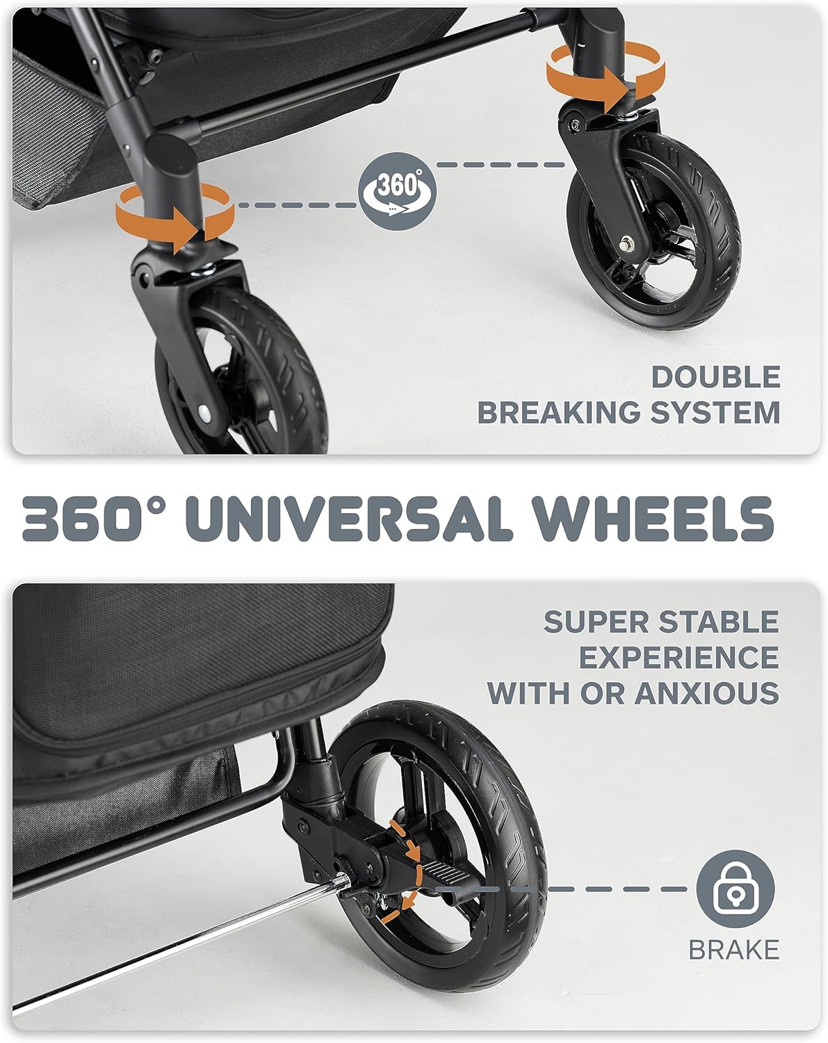 - 【High Maneuverability: Extra large back wheels 】 Zoosky folding dog stroller wheels are for a full-featured lifestyle with 4*360˚ full-suspension wheels. The 2 rear wheels are Extra large to provide smooth, stable moving, ideal on grass, wood, and other stiff hard road or soft surface. There is a safety lock on each rear wheel to keep the Zoosky dog stroller safe while not moving.