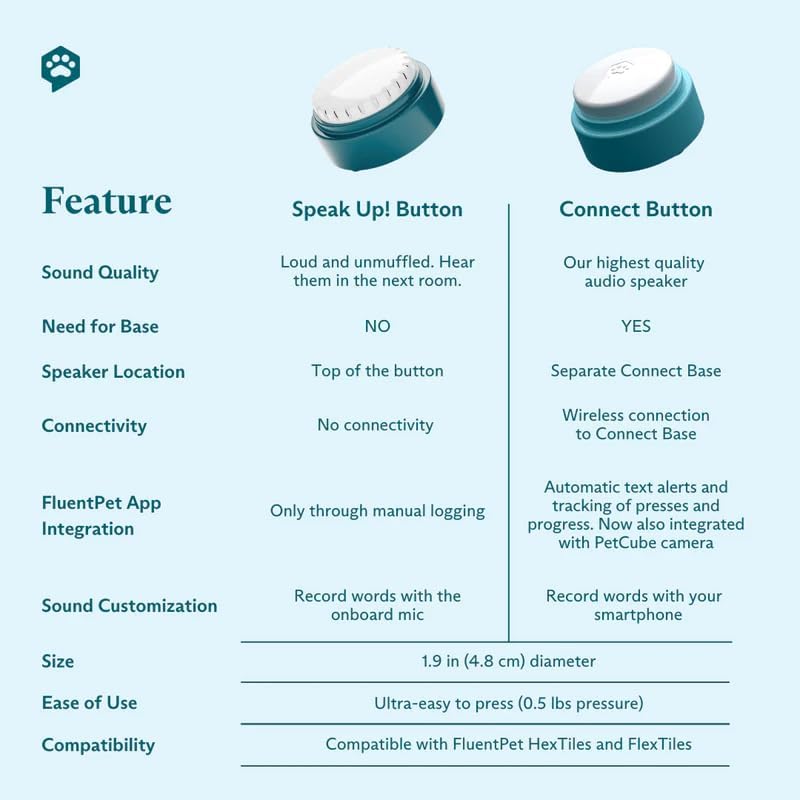 - 【 FROM BARKS & MEOWS TO WORDS 】: With the FluentPet Speak Up! Get Started Kit, you can teach your dog or cat to express their needs and feelings. This complete set includes 2 premium recordable buttons, 2 HexTile mats, 35 customizable stickers, and pre-installed batteries for instant use. Delivers loud, clear, upward-facing sound to help “fluent pets” learn faster and build a richer vocabulary.