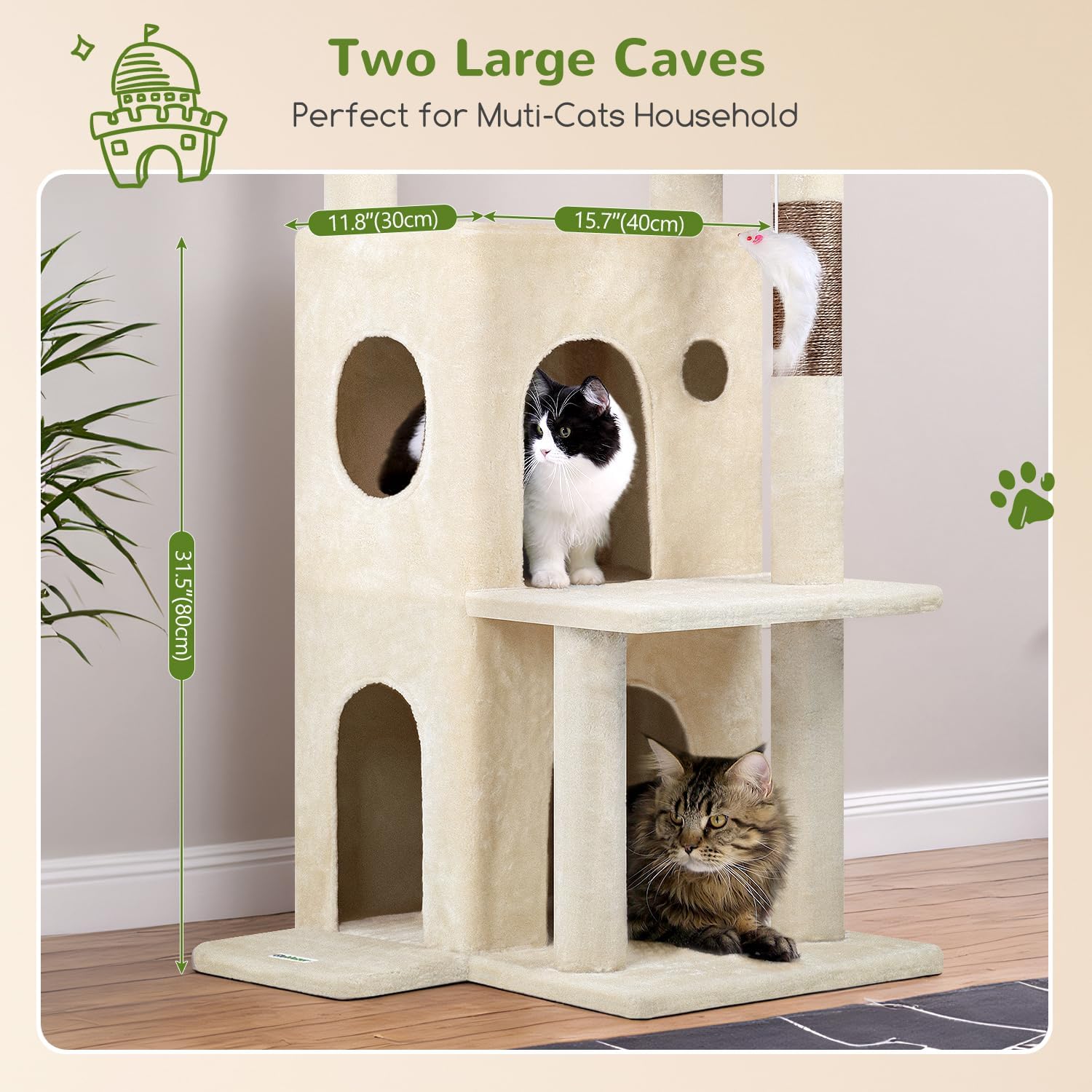 Globlazer Cat Tree Tower for Indoor Cats, 50-inch Adult Cat Tree House for Large Adult Cats with Steps, Scratching Post, 2 Cat Caves, Dangling Toys, FC50, Beige