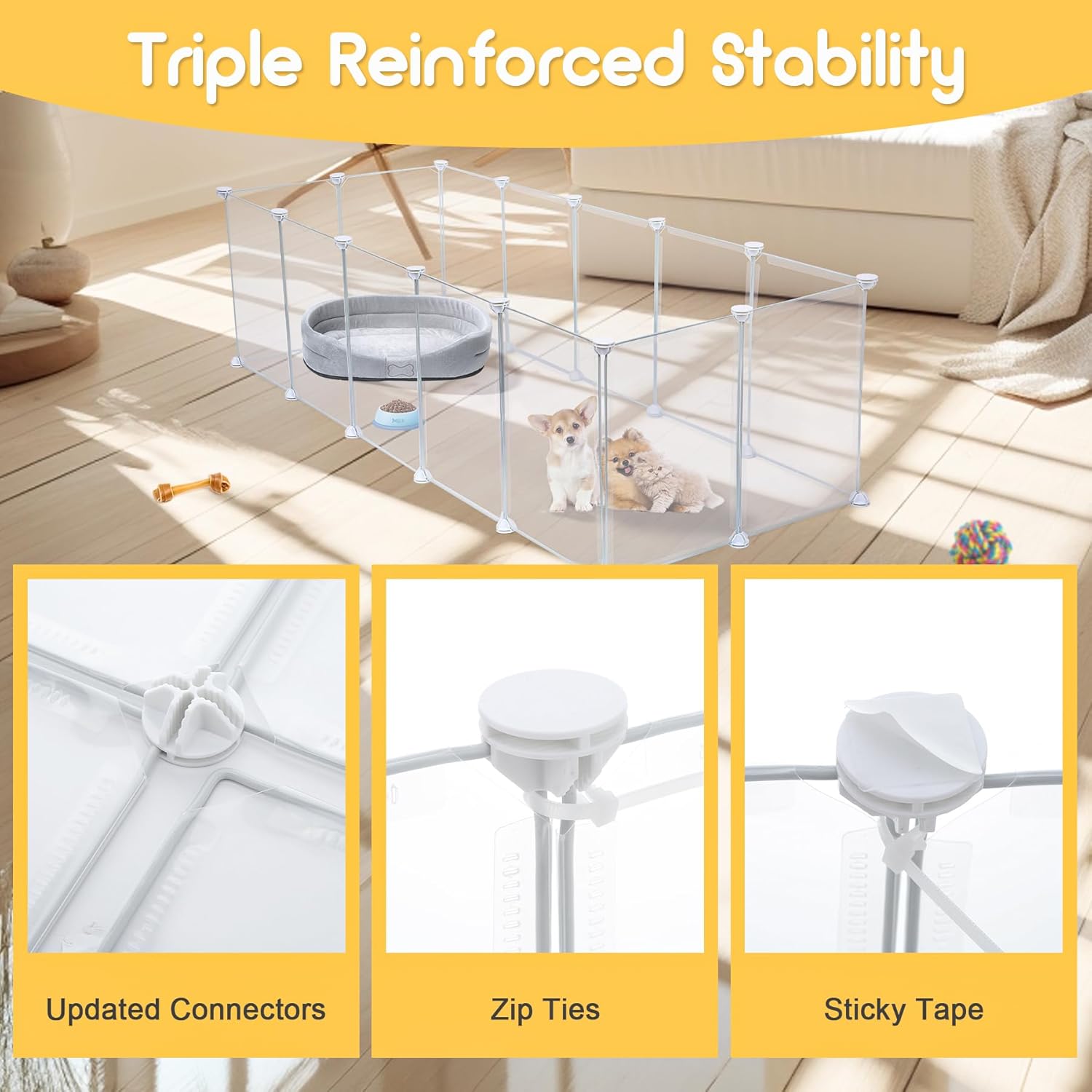 - 【Triple Stability Design】 Pet playpen ensures maximum sturdiness with clip connectors, zip ties, and double-sided adhesive tape. These three layers of support keep the panels firmly in place. No more worries about wobbling or tipping—your pets can enjoy a safe and secure environment at all times