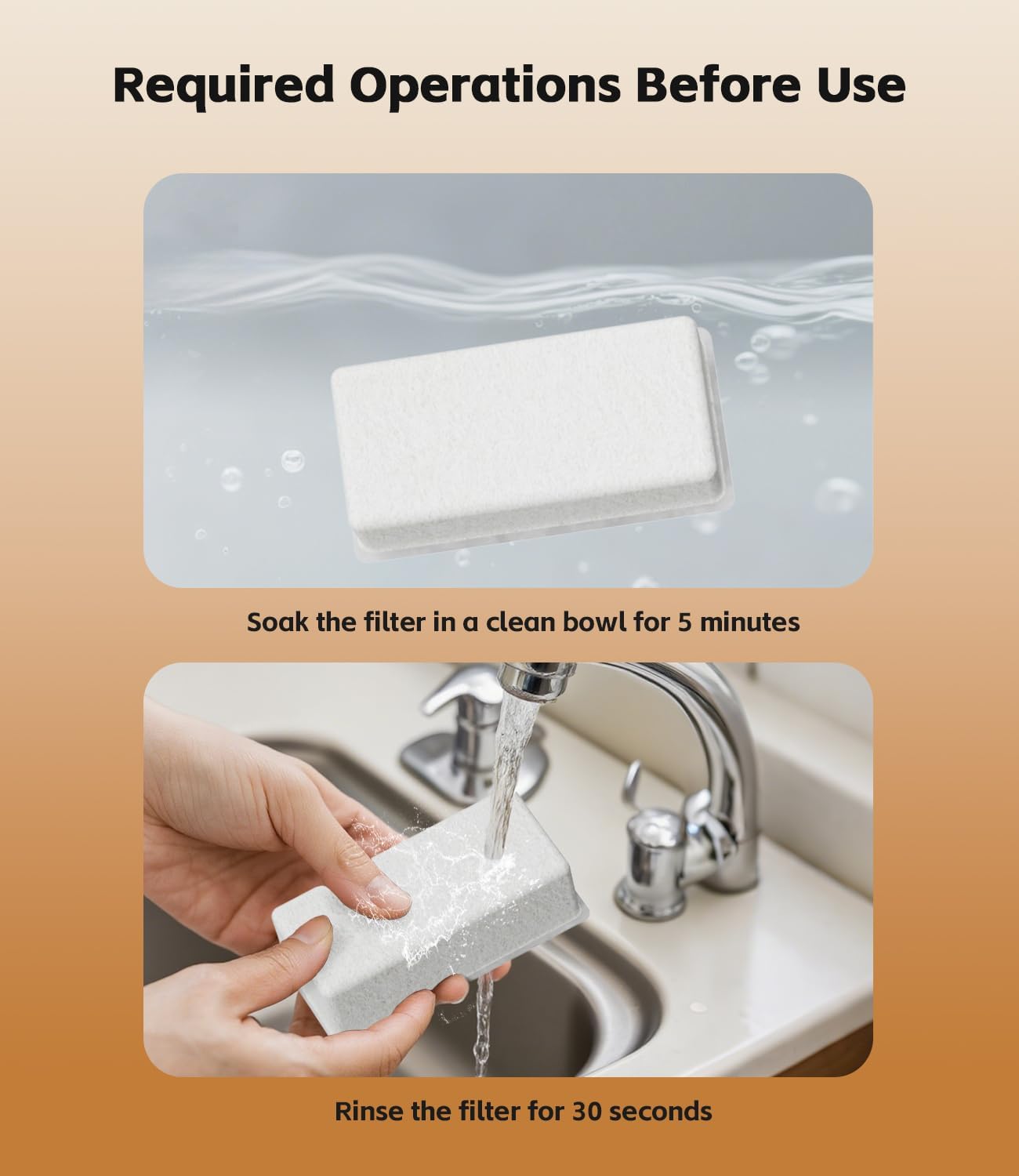 - Read Before Use: Before first use, soak the filter in a clean bowl for 5 minutes, then rinse for 30 seconds. For optimal results, it is recommended to replace the filter every 2 to 3 weeks.