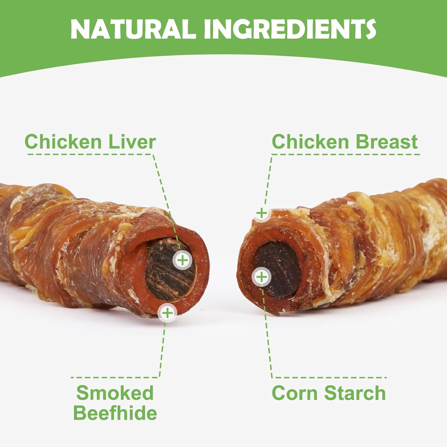 - [Natural Ingredients] Made with chicken breast wrapped around a smoked rawhide roll, mixed with corn starch, rice flour, chicken liver. Low fat, high protein.