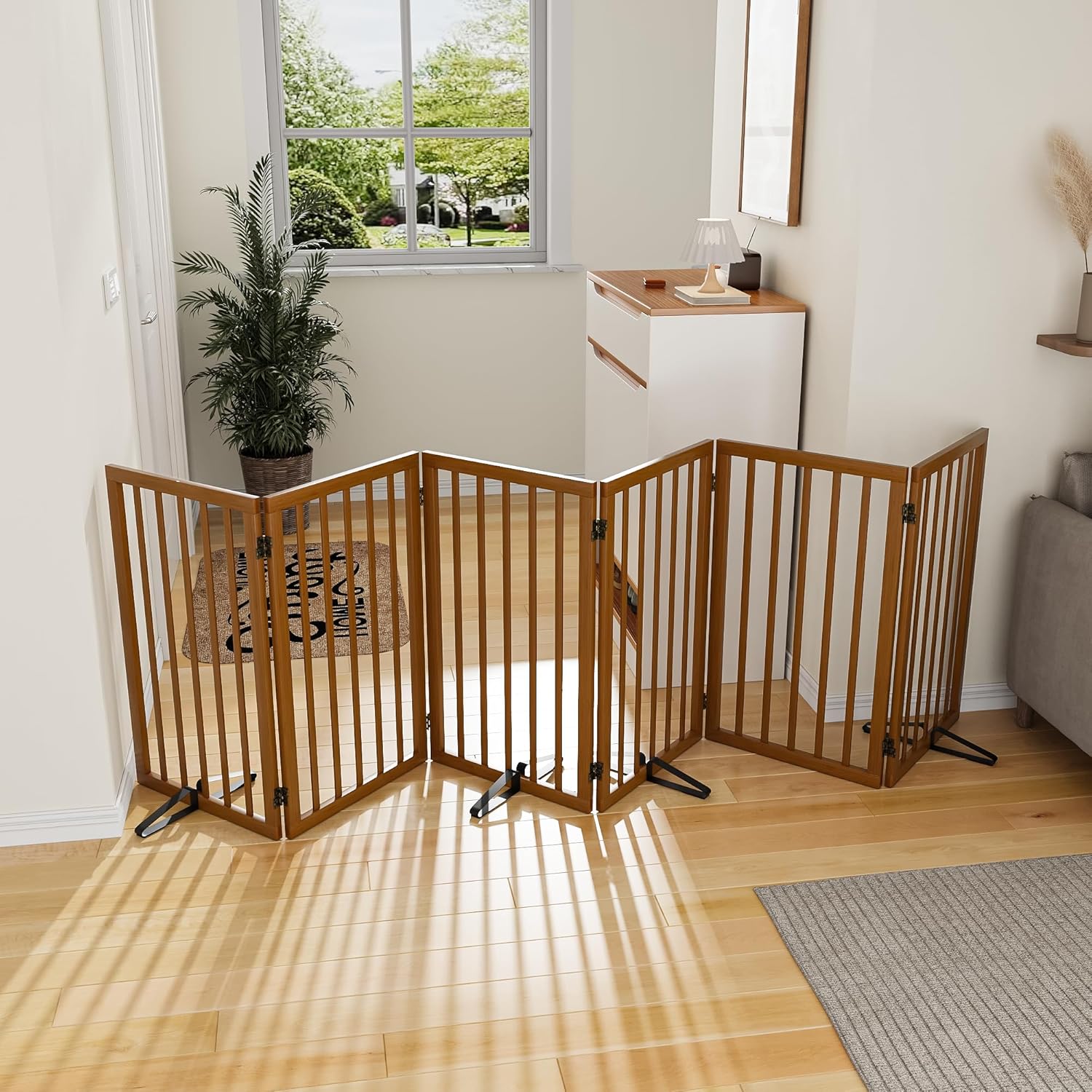 - Folding and Fully Assembled Design: this wooden dog gate quickly unfolds and folds like an accordion, flexible set up and convenient for storage. Completely assembled pet gate with gate feet support