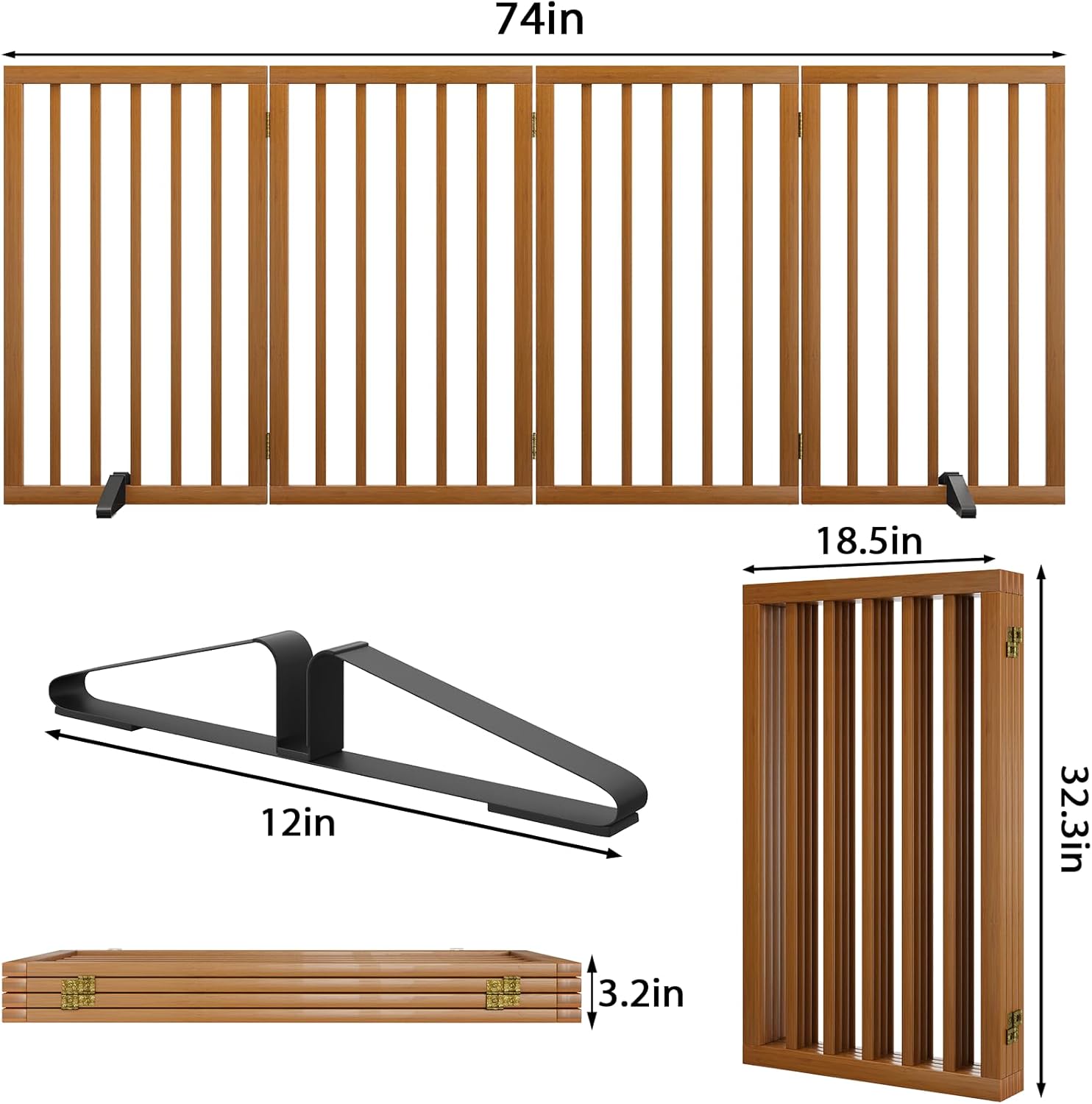- Extra Wide and Tall Dog Gate: Fully open size: 74"Width x 0.8"Depth x 32"Height, collapsed side: 18.5"Width x 3.2" Depth x 32"Height