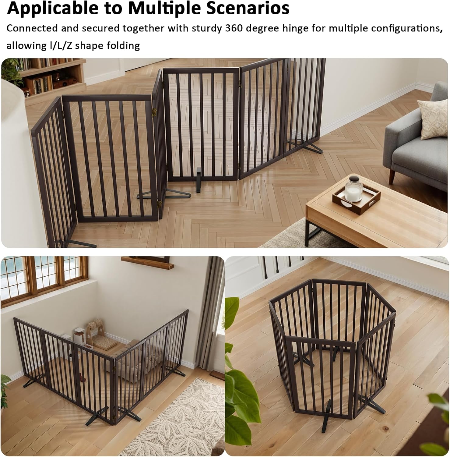 - Dog Gate Indoor: This pet gate features a 360-degree hinges design that allows you to fold it into a wide z shape. Versatile wooden dog gate is a pet enclosure, room divider, pet pen and pet barrier all in one to meet all aspects of your scenario
