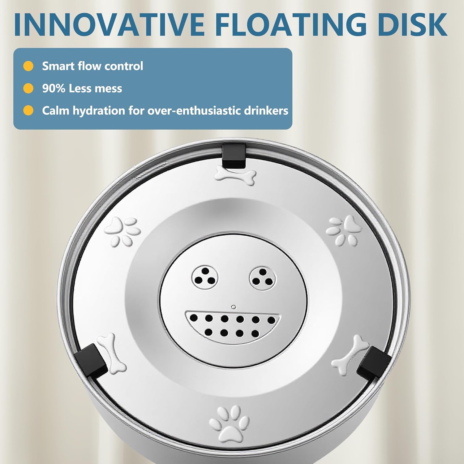 - One-Piece Floating Disk: The dog water bowl goes with a innovative floating disk to slow down water drinking, also helps keep dust, dirt, and pet hair from falling into the water, ensuring fresh and clean drinking water for your pet