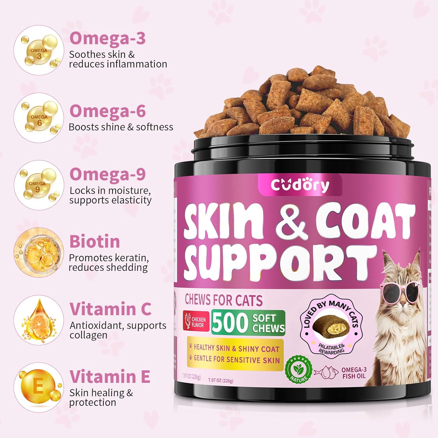 Natural Skin and Coat Support for Cats - Crunchy & Creamy Chews with Omega 3, Biotin & Vitamin E for Healthy Skin, Shiny Fur, Cat Supplements & Vitamins -Chicken(500 Chews