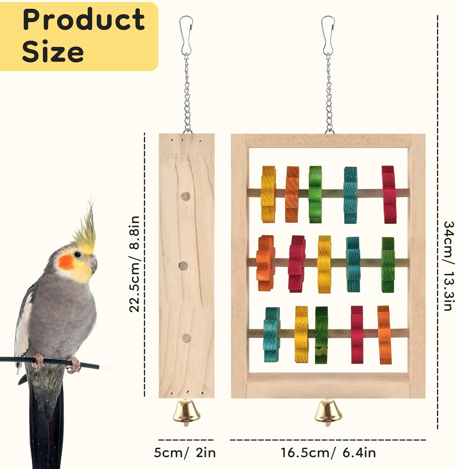 - Keep Healthy: Climbing, chewing, and biting are innate instincts of parrots. This bird cage chewing toy for parrots encourages parrots to unleash their natural instincts, providing them with climbing and biting exercises that keep them busy and energized. Additionally, the bell and the rotatable wooden block can encourage the parrot to peck and rattle, which serves to trim the beak and exercise the claw muscles, ensuring your beloved bird remains in optimal health