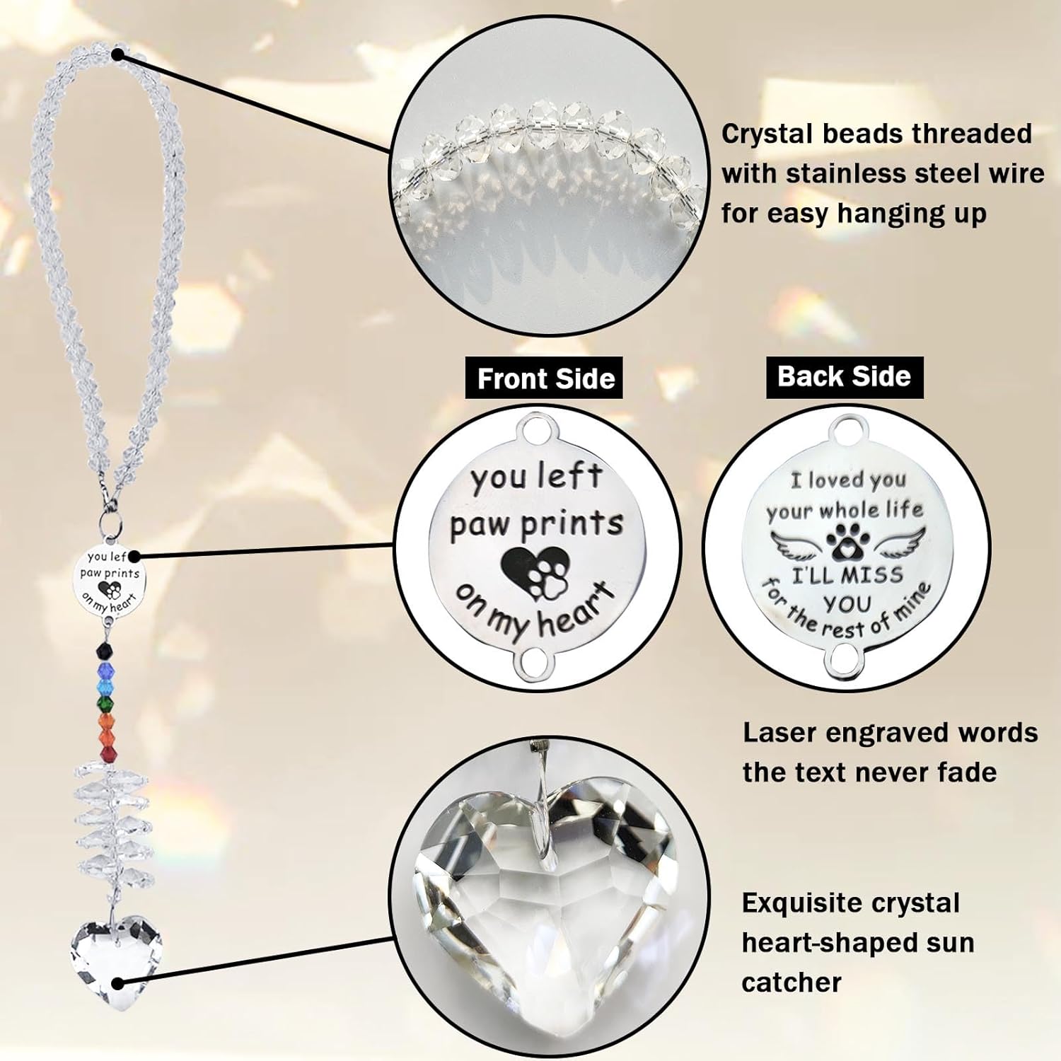 - Unique Engraved Words: Attached with a special heart-shaped pendant at the middle of the sympathy suncatcher, engraved words of "I loved you your whole life I'LL MISS YOU for the rest of mine" on the front side, and "you left paw prints on my heart" on the back side. A timeless keepsake that preserves the memory of the furry friend's legacy, brings warmth and solace, a fitting tribute to the loyal dog or cherished cat