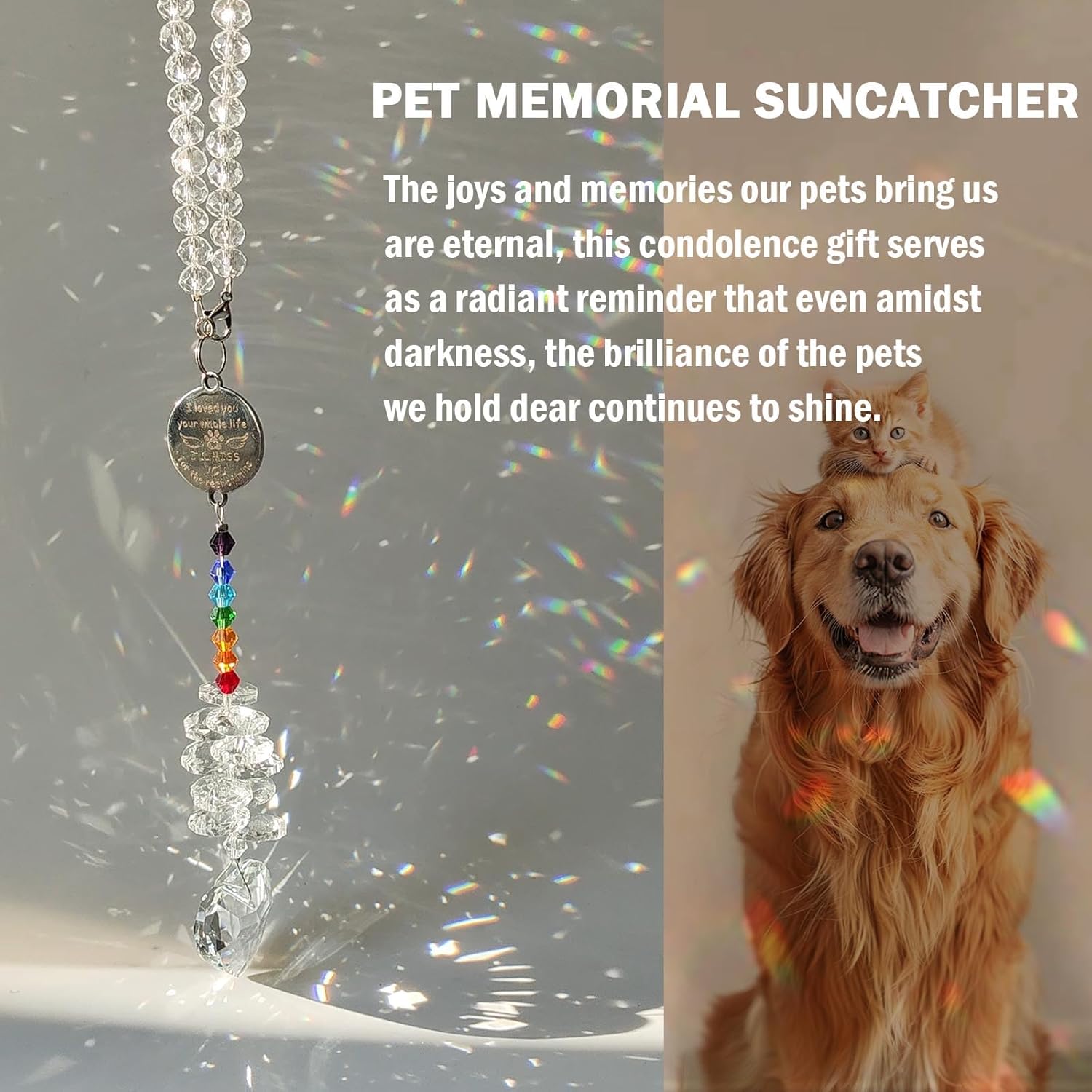 - Crystal Rainbow Maker Suncatcher: The rainbow represents a bridge between the earthly and the spiritual, making this pet loss gift a powerful emblem of hope and eternal connection. The pet loss bereavement gift serving as a radiant reminder that even amidst darkness, the brilliance of the pets we hold dear continues to shine