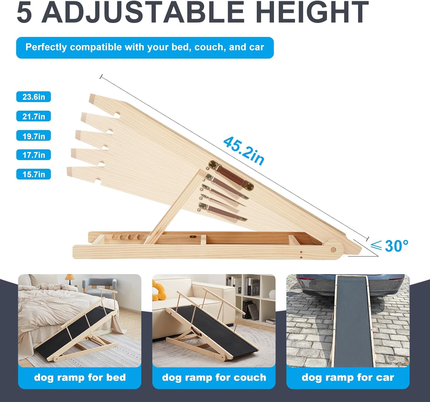 Dog Ramp for Bed and Couch, 5 Height Adjustable Solid Wood Pet Ramp for Small, Medium & Large Dogs, Collapsible Anti-Slip Dog Ramp for Sofa, Couch & Beds(Wood, 115)