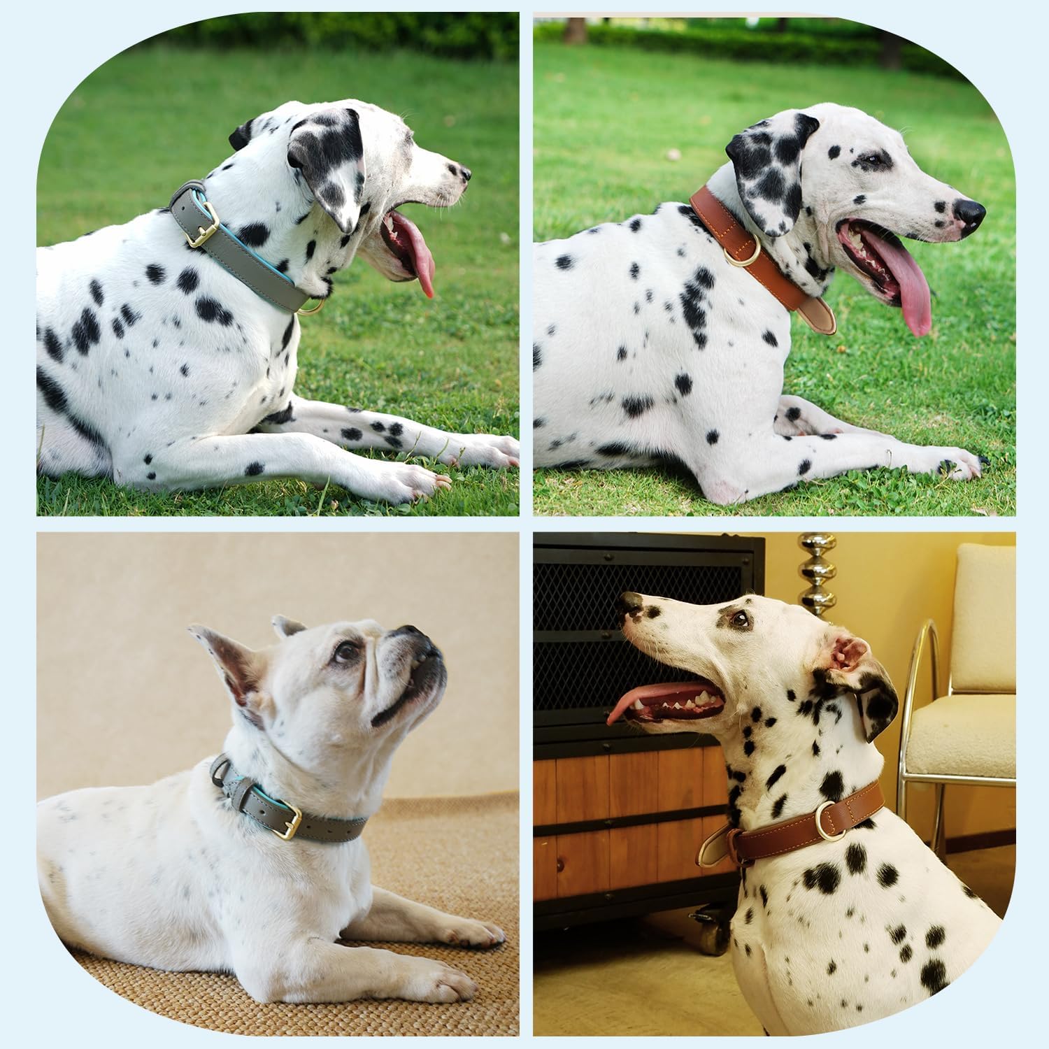 - STYLISH HANDMADE DESIGN : Beautiful two-color reconstituted leather dog collars are suitable for matching;Reconstituted leather; Zinc alloy buckle and D-ring will never rust. Double D-rings to better secure the leash and dog ID tag for easier walking.