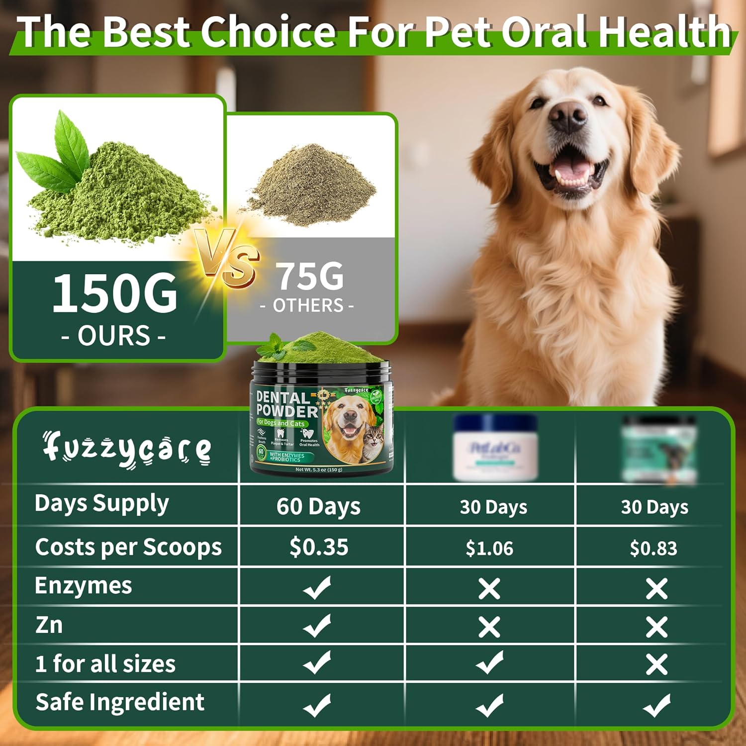 - 60 Days Long-Lasting Pack:Fuzzycare Dog Dental Powder 150g large capacity pack, one bottle to meet the oral care needs of two months, Keep using it for a period of time and it will gently improve your dog's problems. so that your dog's teeth are clean and fresh for a long time