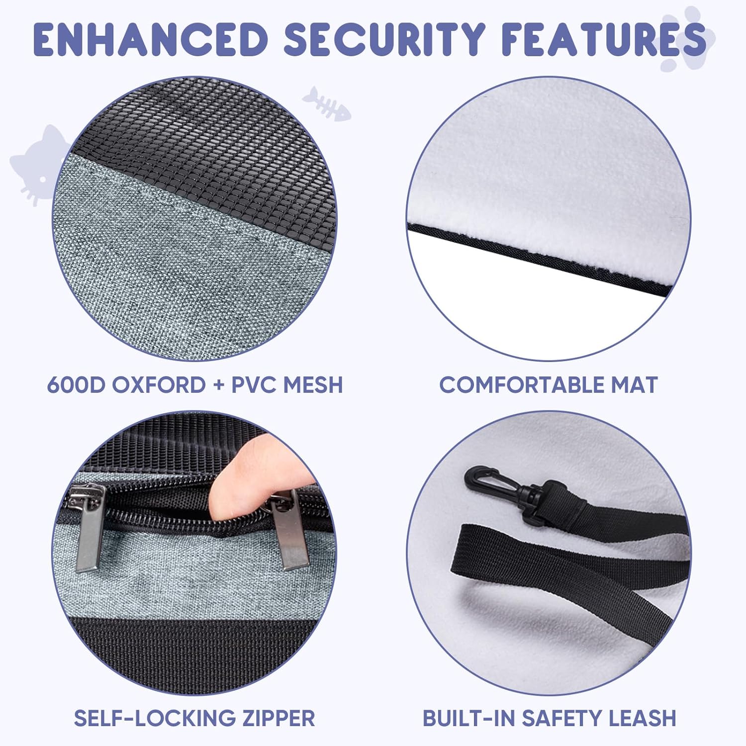 - Durability and Comfort: Made of 600D waterproof fabric and PVC mesh, this pet carrier for cat resists daily wear and scratches from pets; The integrated iron wire and rubber frame maintain its shape even when empty; While the 3mm fiberboard base offers stability, and a removable soft plush mat ensures a comfortable sleeping space for your pet during trips